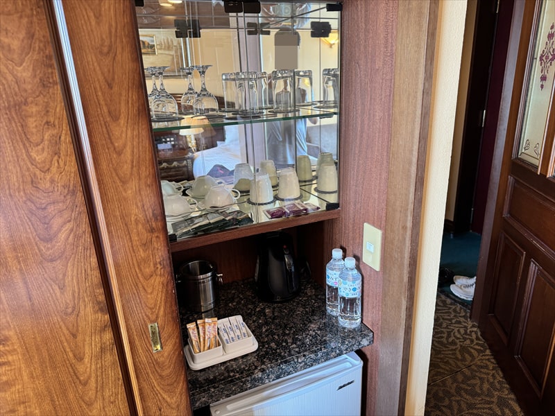 水屋にはミネラルウオーターと電気ポット、カップ、グラス、コーヒー、紅茶セットが置かれています。