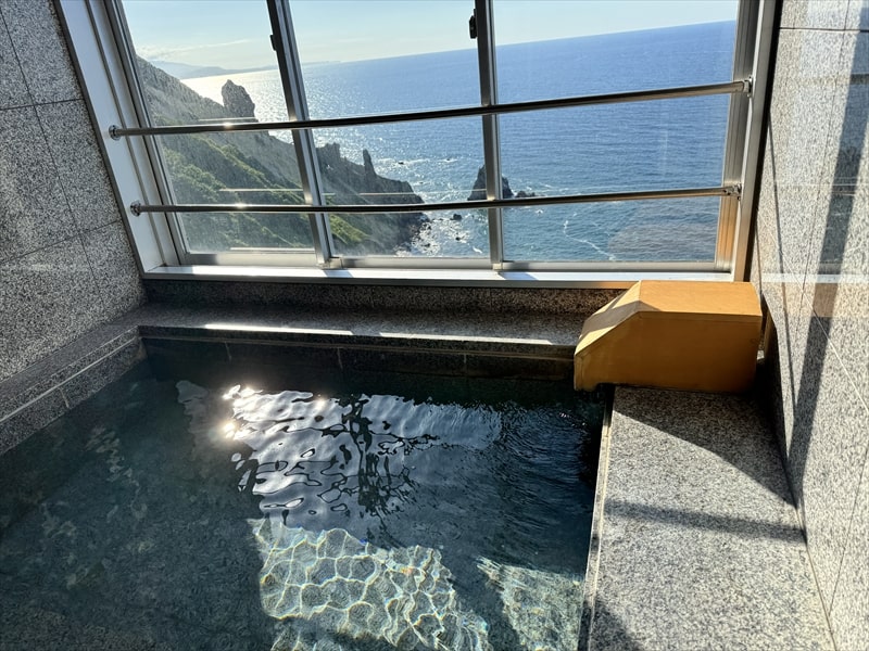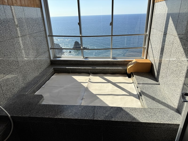 お風呂は窓がある半露天風呂となっていて、窓を開けますと海の波の音を聞きながら入浴できます。