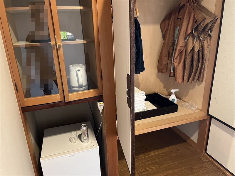 部屋にはタオル、バスタオル、スリッパ、お茶セット、冷蔵庫、室内金庫があり、半纏と帯は置かれていますので、浴衣はフロントに置かれているものを自分で部屋に持ってきます。
