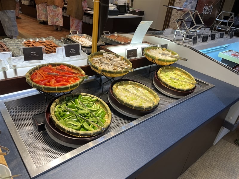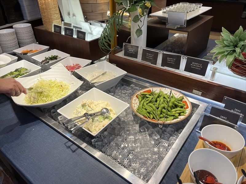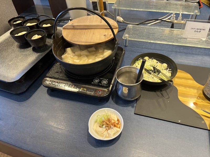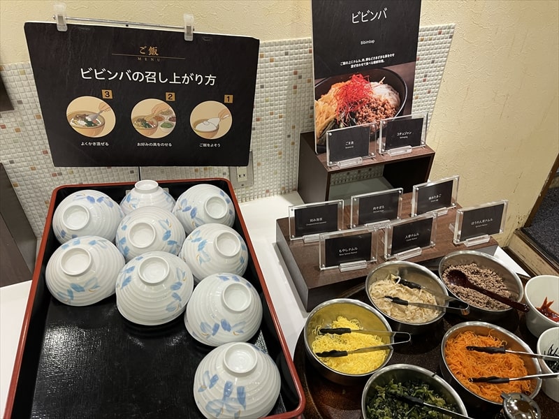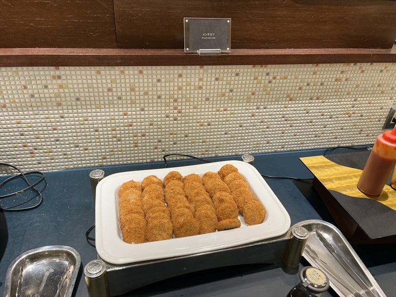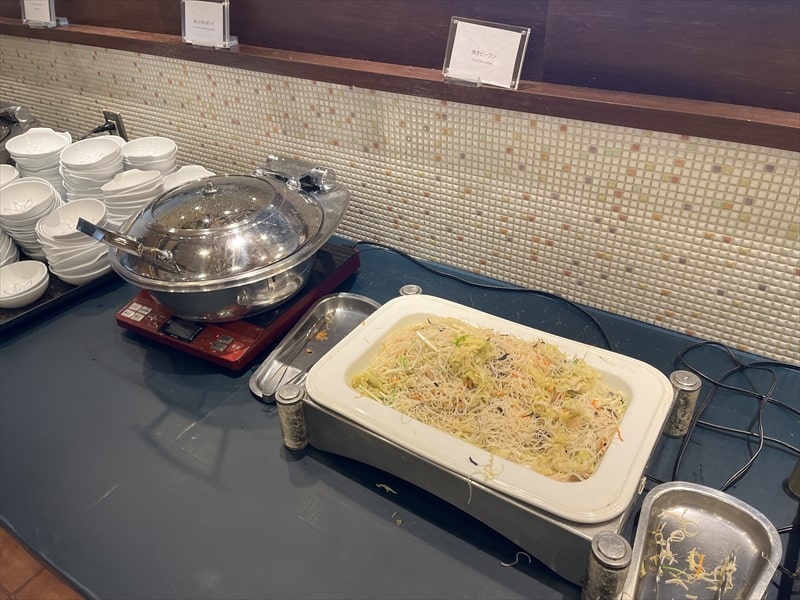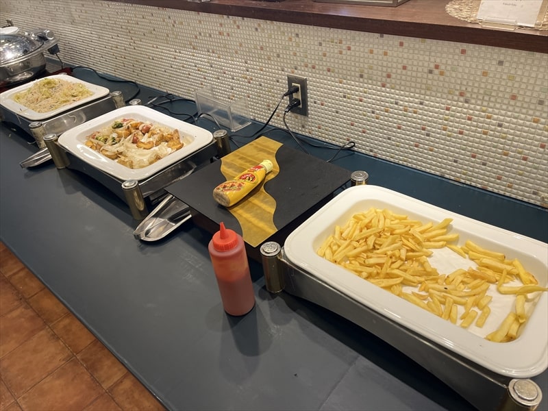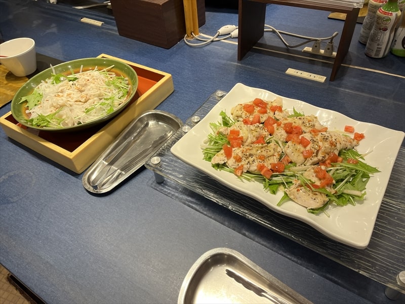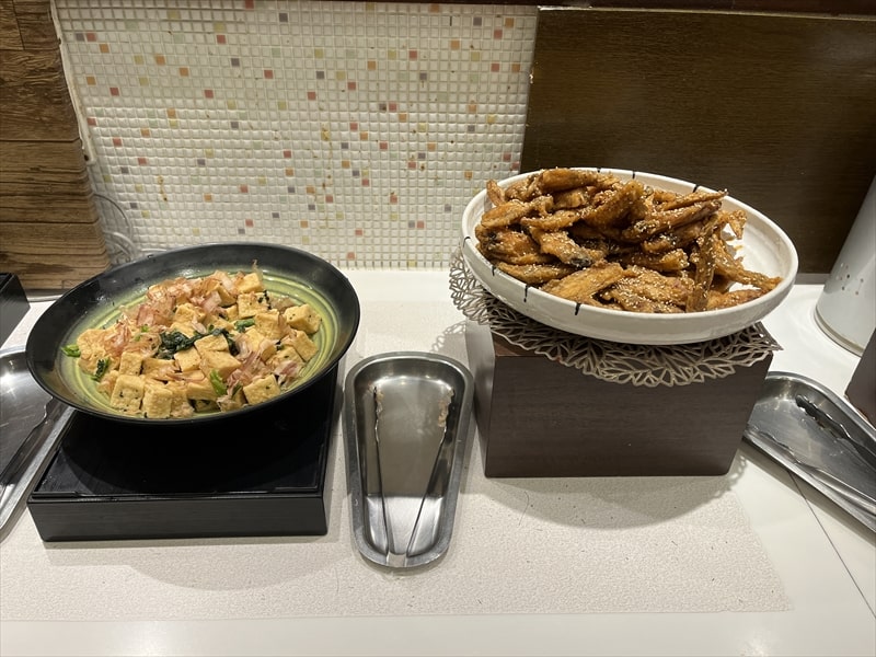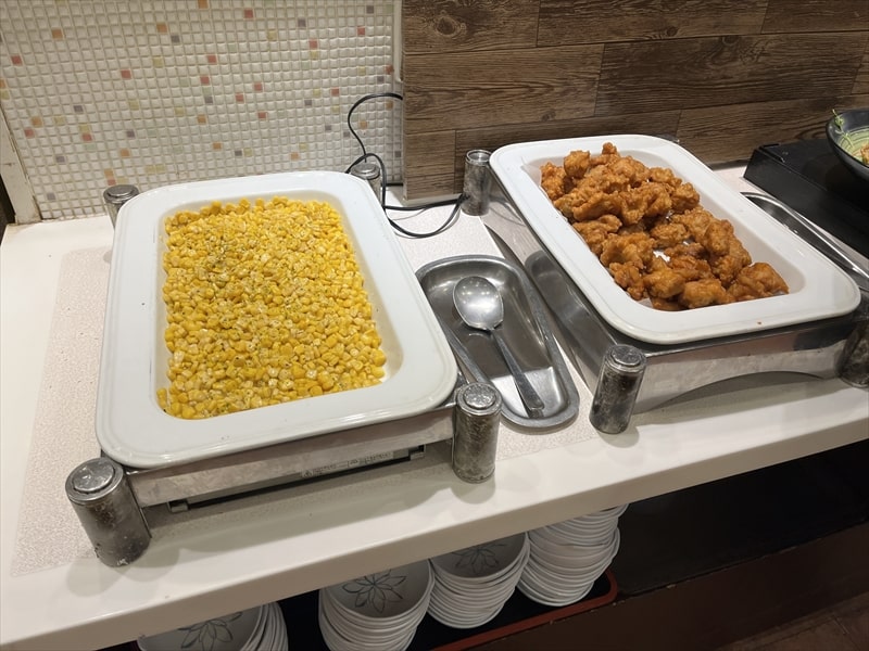 それ以外の料理はラーメン、ピリ辛そぼろゴボウ、手作り温泉湯豆腐、メンチカツ、ポテトフライ、ジュノベーゼグラタン、ヤンニョムテジ、手羽先、唐揚げ、コーンバター、天ぷら、サラダバー、ビビンバなどがありました。