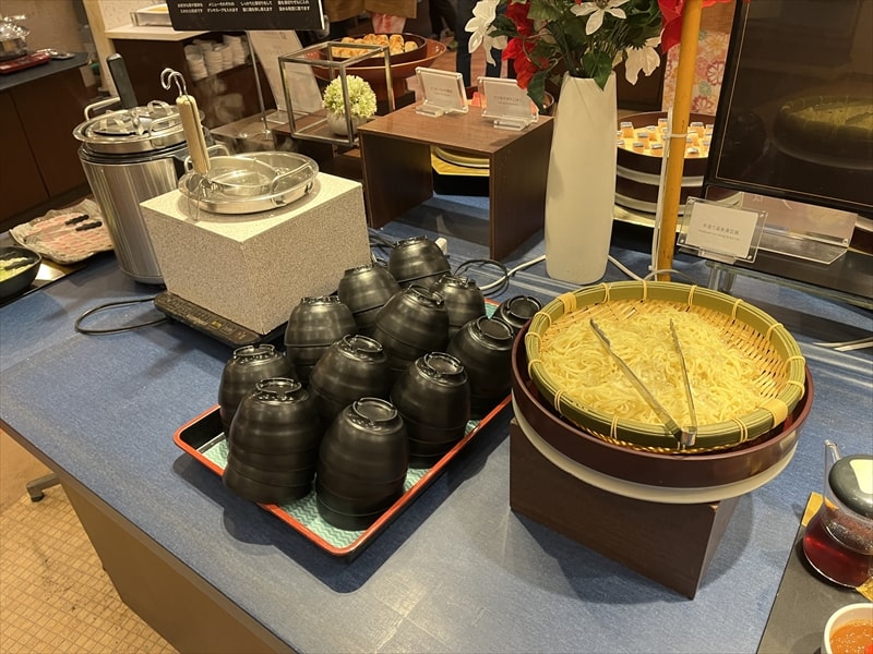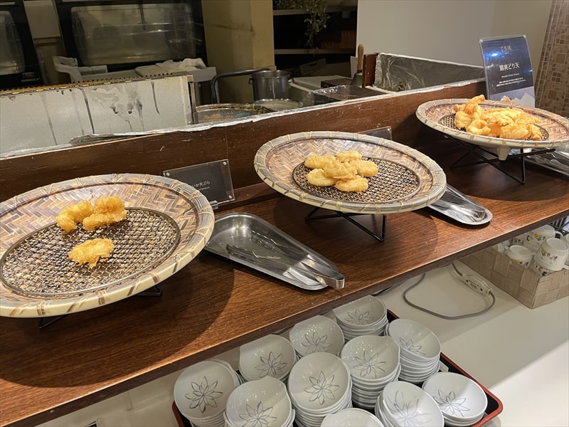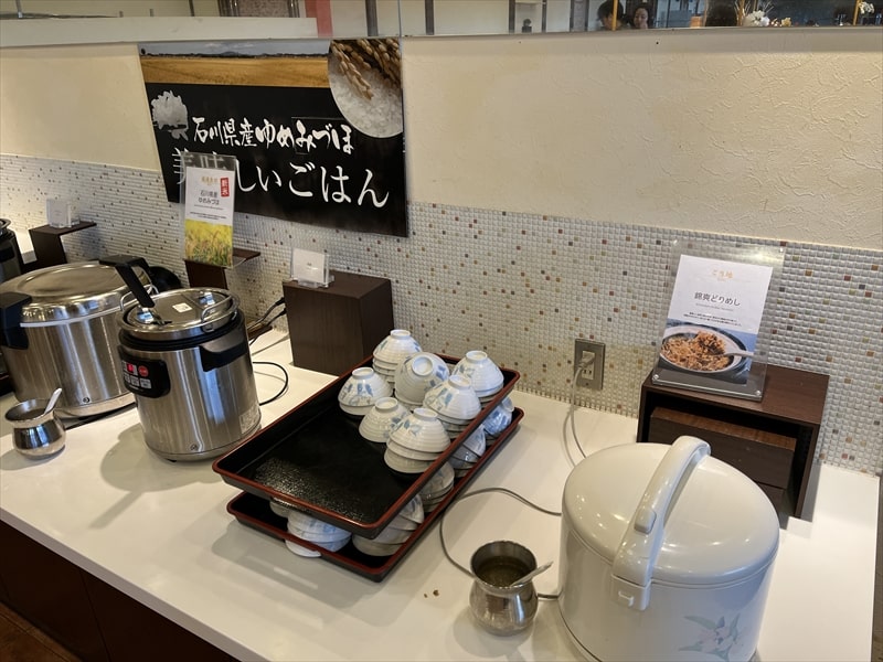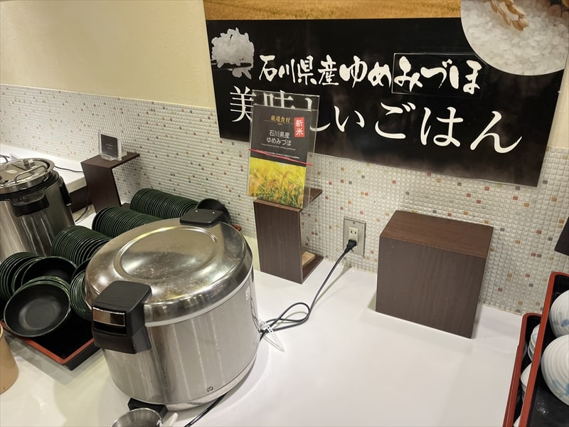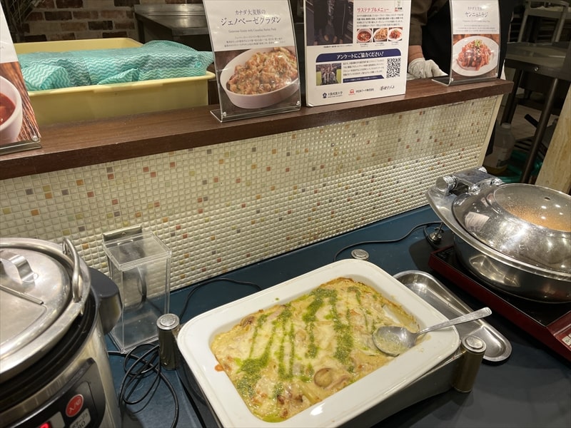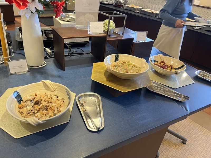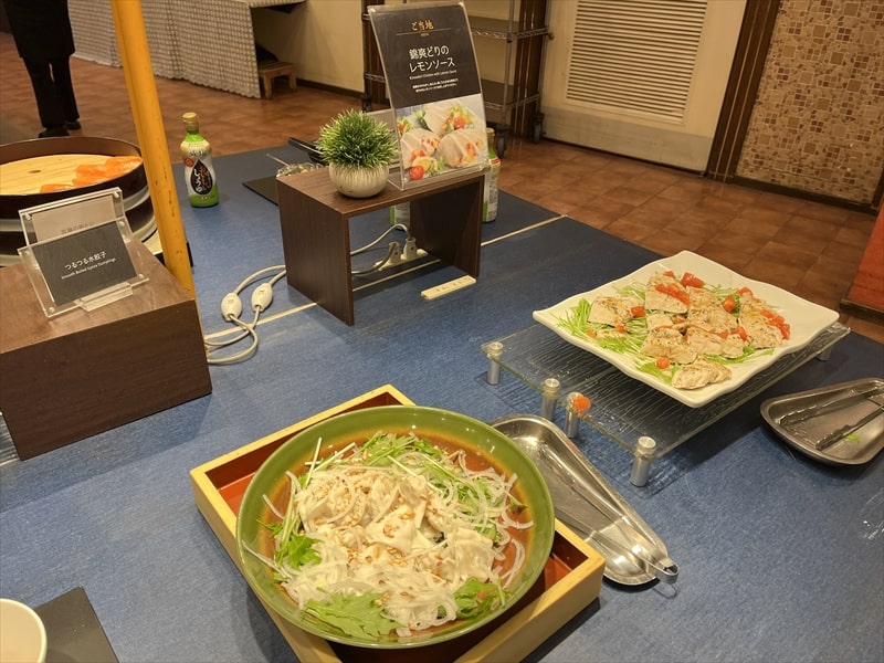 その他の料理は焼きビーフン、鯖と大根の煮付け、ミートボール、出汁巻き玉子、コロッケ、温泉卵、きのこのおろし和え、ピリ辛そぼろごぼう、さつまいもの甘露煮、錦爽どりめし、石川県産ゆめみずほ新米ご飯、味噌汁、ビーフカレー、サラダバー、伊勢うどんなどとなっています。