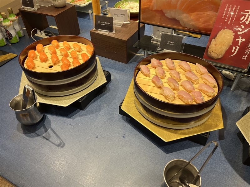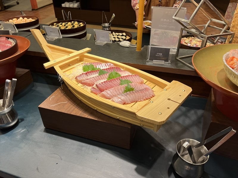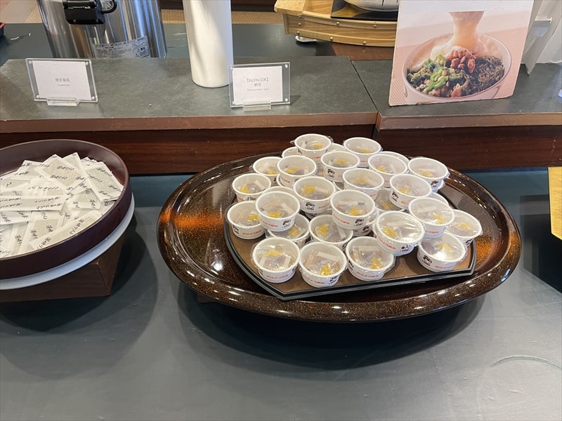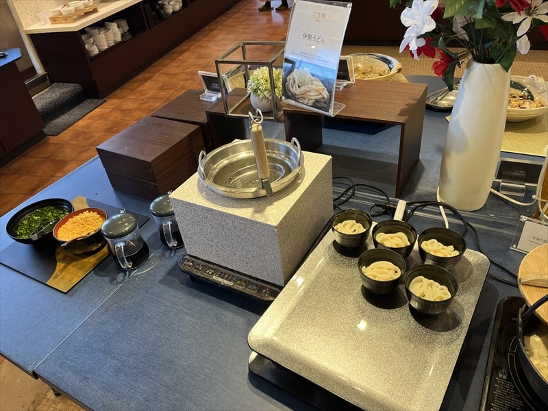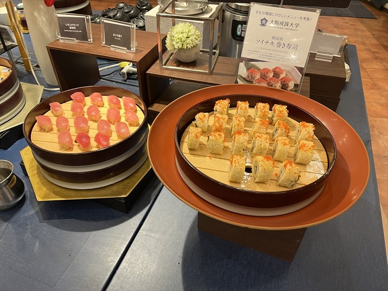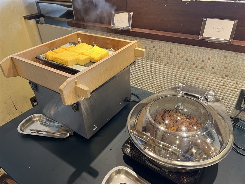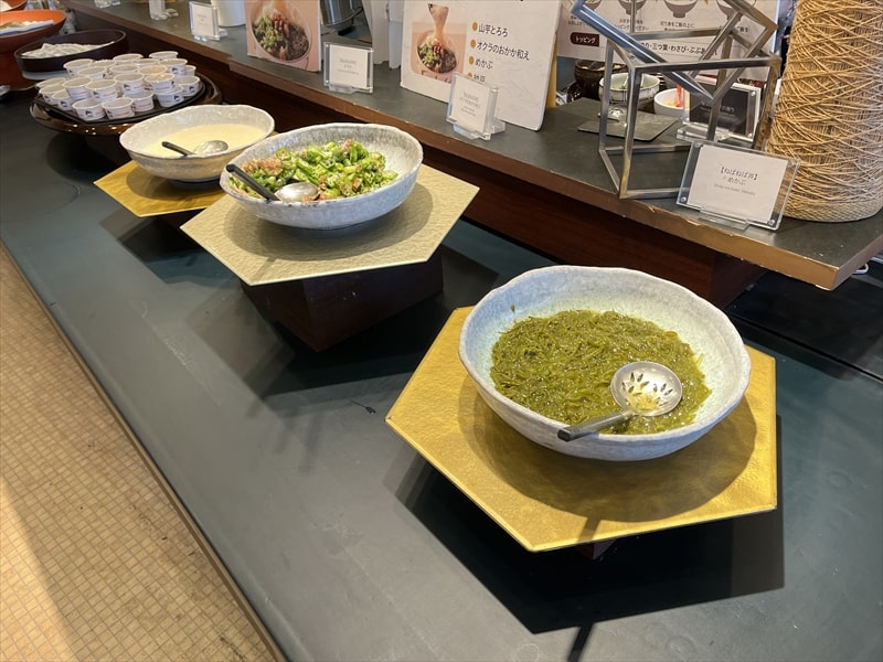 その他の料理は焼きビーフン、鯖と大根の煮付け、ミートボール、出汁巻き玉子、コロッケ、温泉卵、きのこのおろし和え、ピリ辛そぼろごぼう、さつまいもの甘露煮、錦爽どりめし、石川県産ゆめみずほ新米ご飯、味噌汁、ビーフカレー、サラダバー、伊勢うどんなどとなっています。