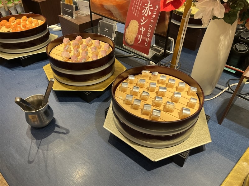 握り寿司は鮪、ブリ、トラウトサーモン、レモン〆サンマ棒寿司、韓国風ソイチキ巻き寿司がありました。