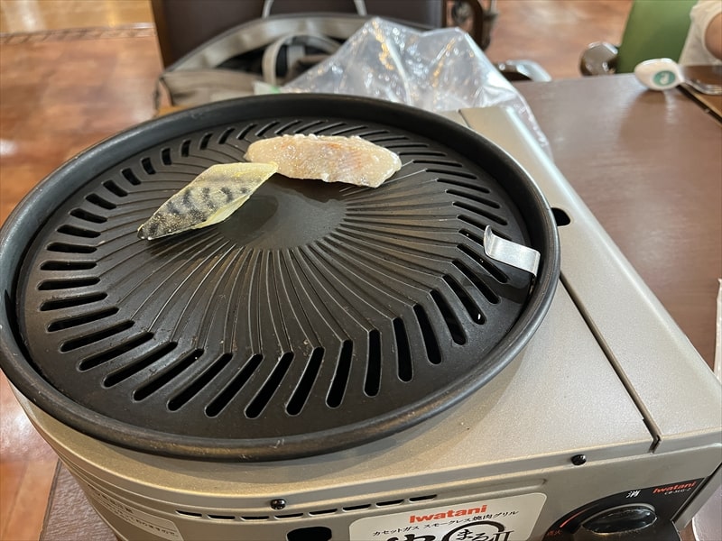 そして無煙コンロが用意されていましたので焼き魚の赤魚の塩麹焼きと鯖の干物をテーブルで焼いて頂きました。