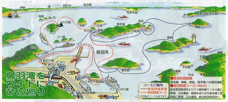 乗船のコースは赤い点線の鳥羽周遊コースで、時間は45分ほどでした。