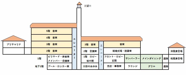 本館は地下1階、地上3階となっていて、1階にフロント・ロビー、サンパーラー、メインダイニングがあります。