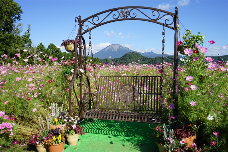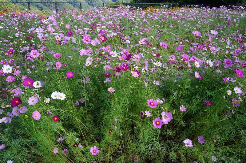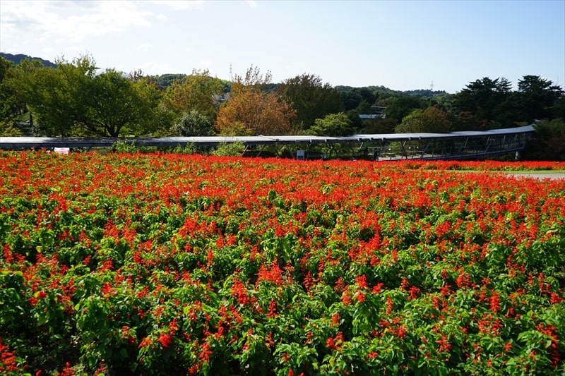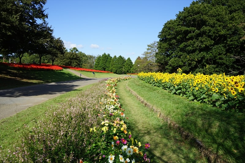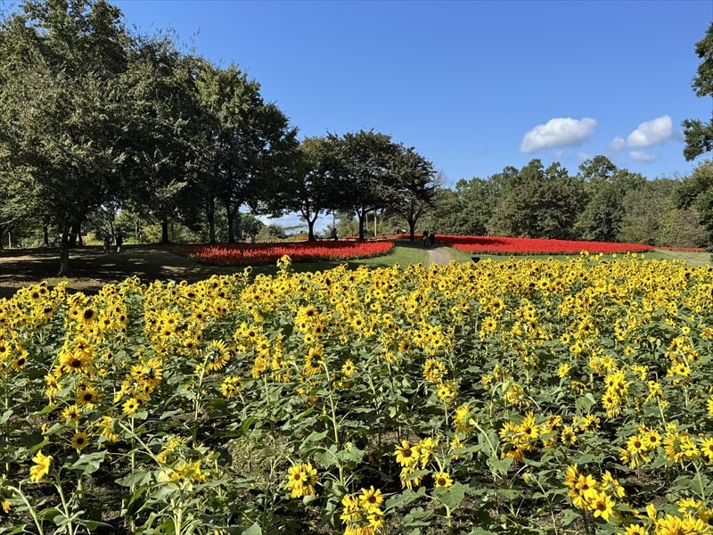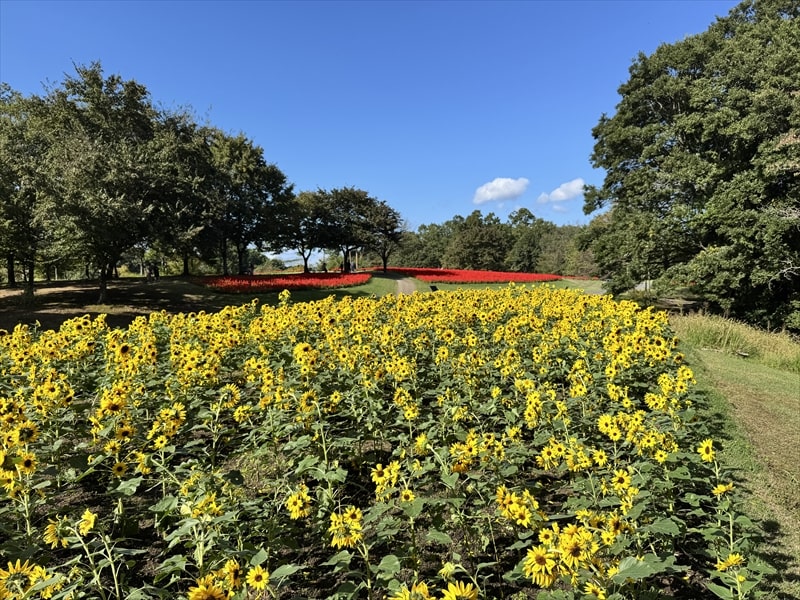 私たちは10月に訪れましたので、コスモス、ヒマワリ、サルビアが奇麗に咲いている時期でした。