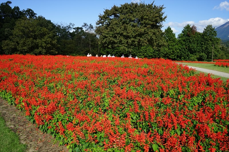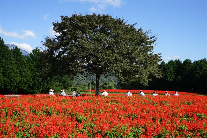 花の丘の赤いサルビア畑の向こうに見える大山の姿も素敵なのですが、印象的だったのはサルビア畑で園内の花を手入れする方が一直線に並んで休憩している姿でした。
