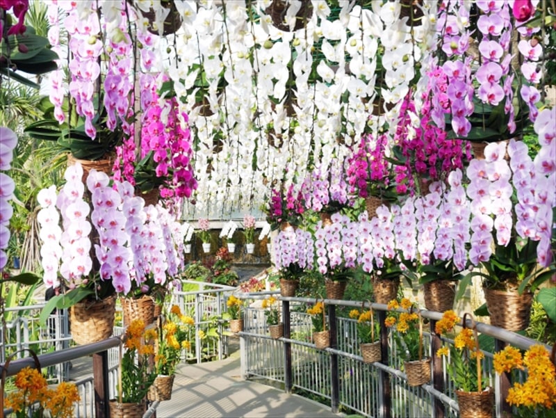 温室のフラワードームでは熱帯・亜熱帯植物や洋ラン1000株以上が年中咲いているので、寒い日でも花を楽しめます。