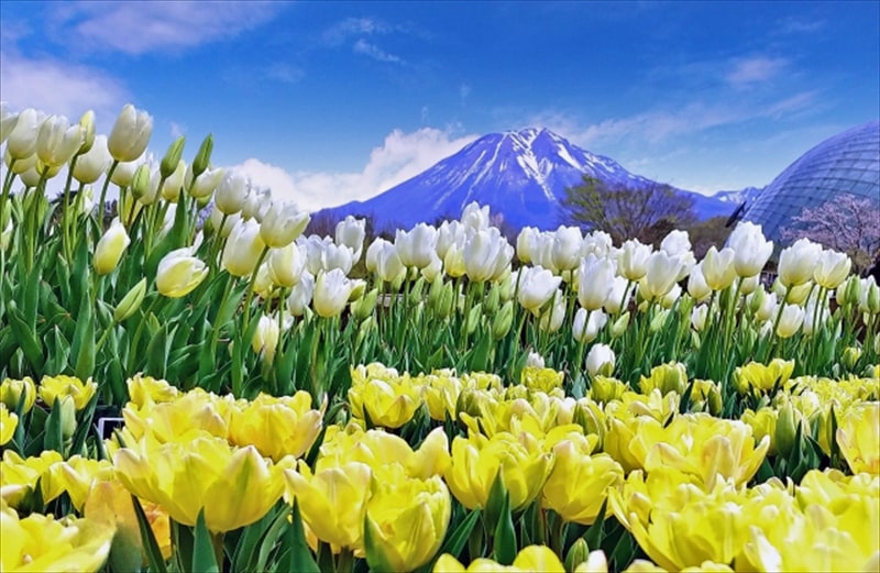 園内の花の丘や花の谷などからは雪を残す大山を背景に花畑を楽しめるのが魅力です。