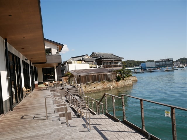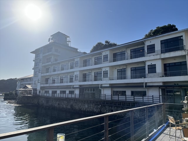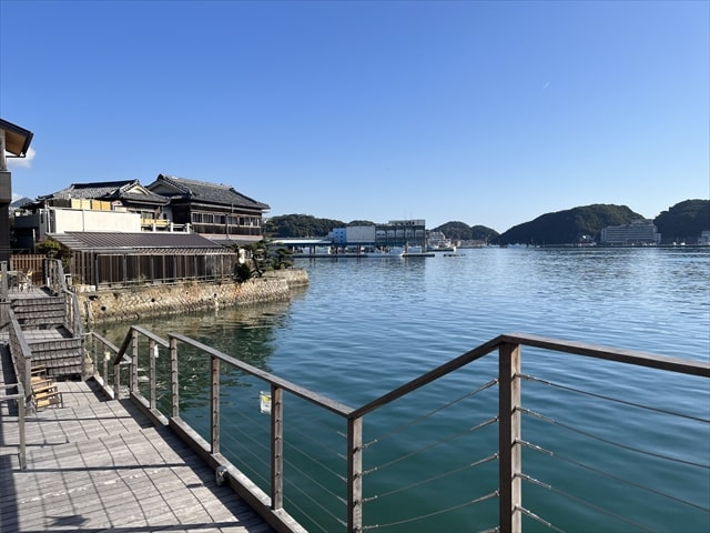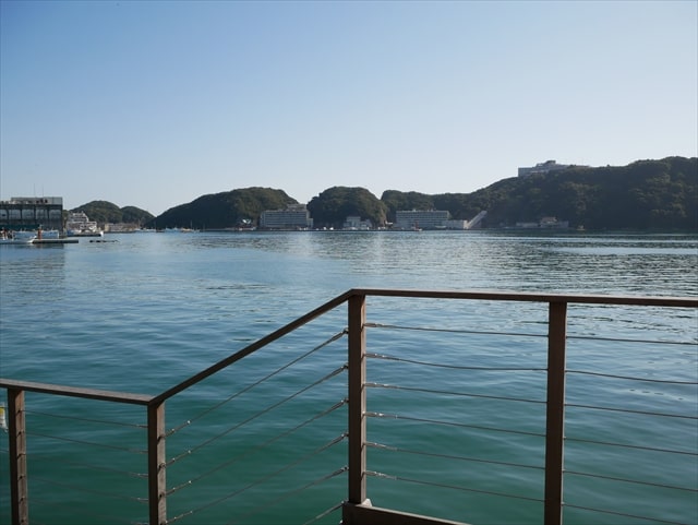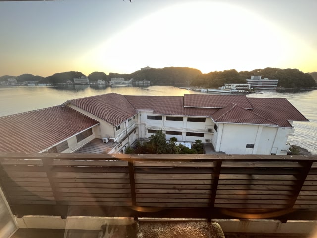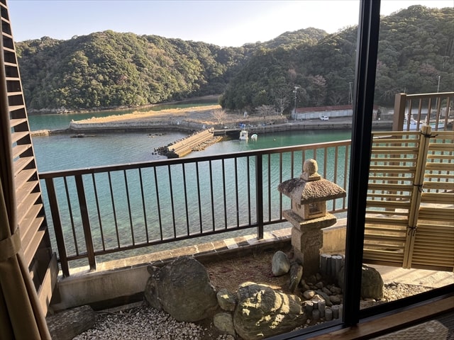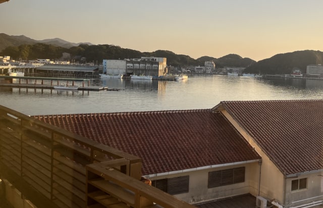 こちらは部屋からの景色ですが、この漁港の建物方面の景色が大浴場からの眺望となります。