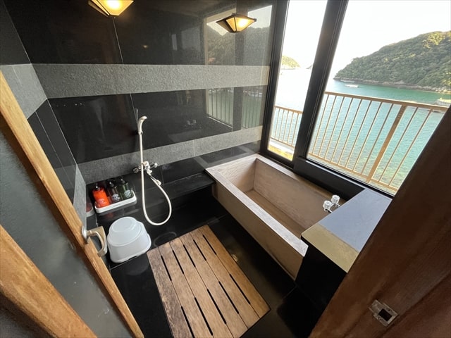 源泉かけ流しで海を眺めながら入ることができたのですが、硫黄泉の臭いがしませんでしたので、泉源は含硫黄-ナトリウム・カルシウムー塩化物泉ではなくもう一方の泉源のアルカリ性単純温泉の方だと思われます。