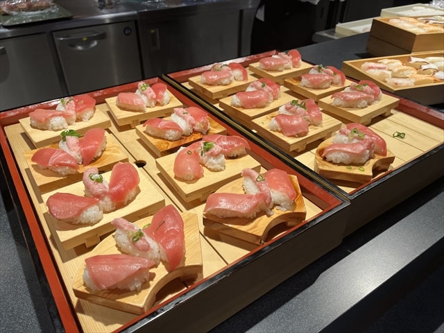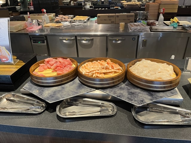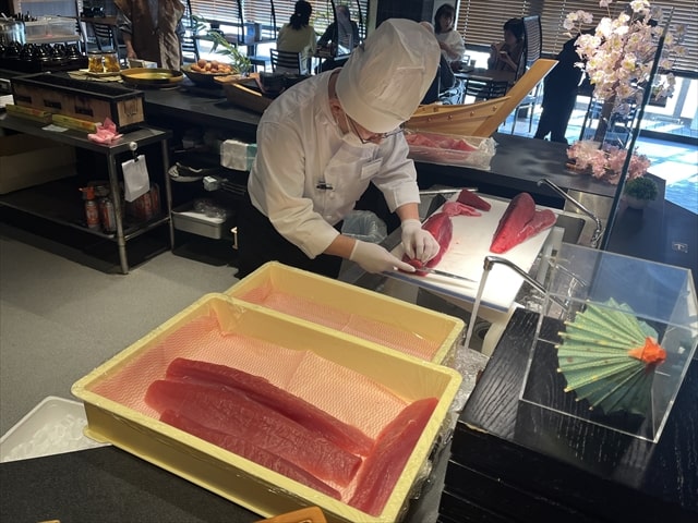 勝手丼のコーナーのカウンターでは係の方がマグロをさばいていましたが、勝手丼に置かれているマグロとは違っていましたので、ディナーの刺身用を今から用意しているのでしょうか。