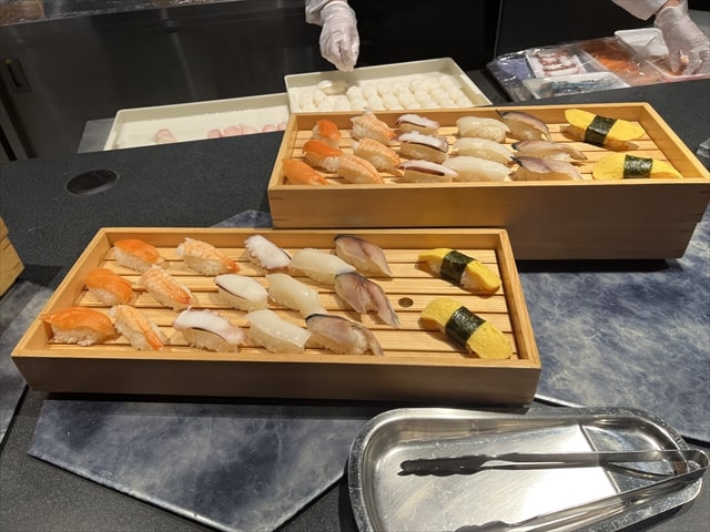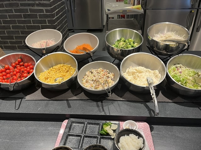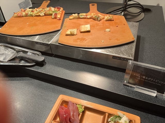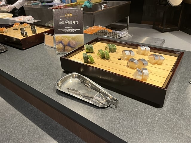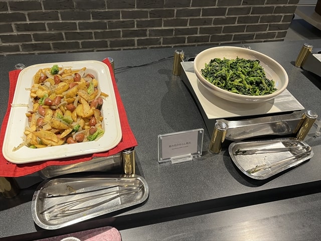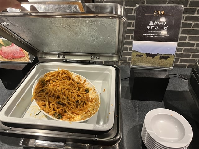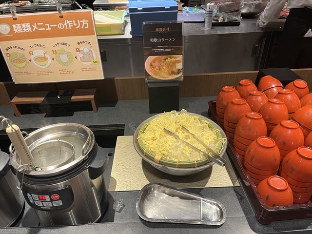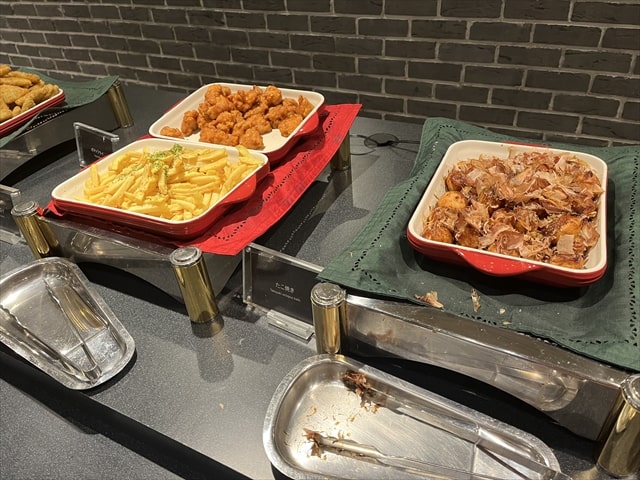 天ぷらはこごみ、海老、サツマイモ、寿司はめはり巻き寿司、さんま棒寿司、さば握り、イカ握り、サーモン握り、海老握り、玉子握り、ピザ、唐揚げ、ポテトフライ、タコ焼き、チーズフライ、熊野牛のボロネーゼなどは彩朝楽と同じでしたから食べませんでした。