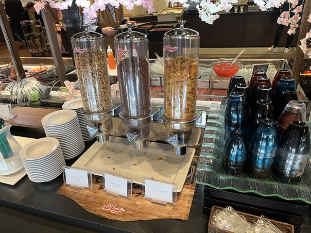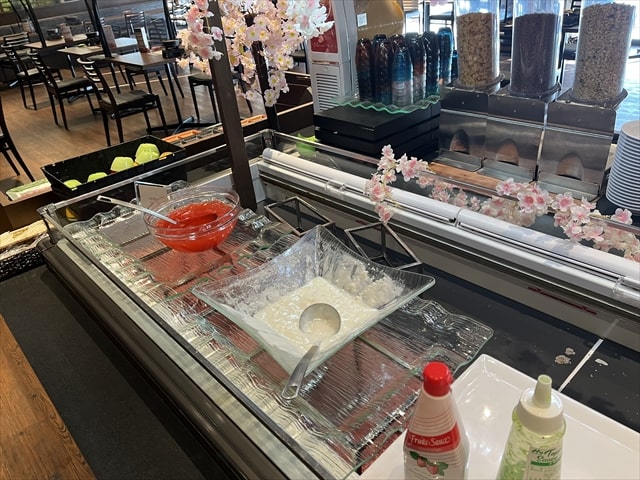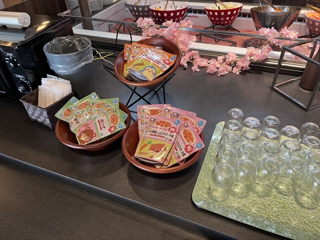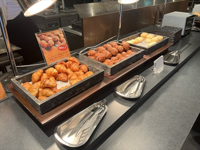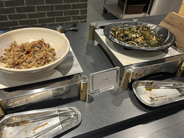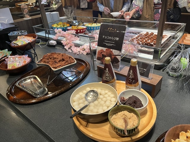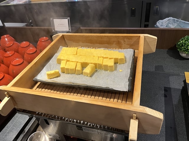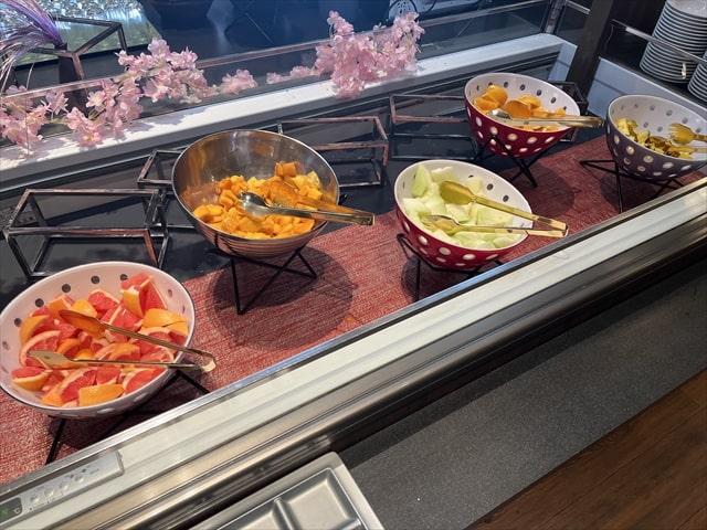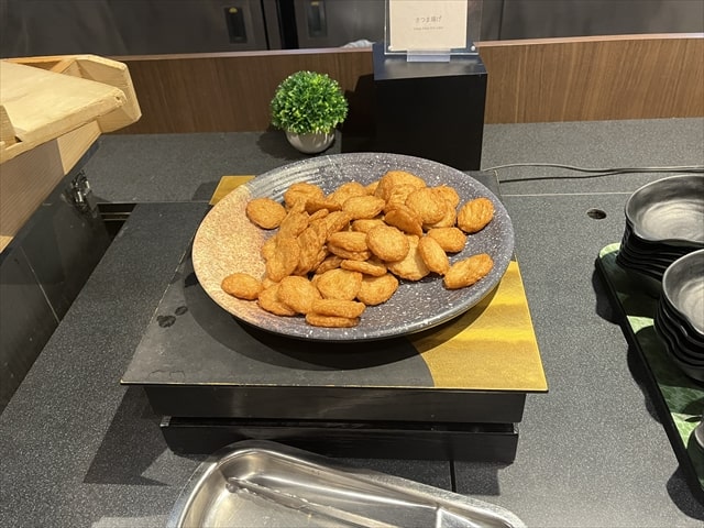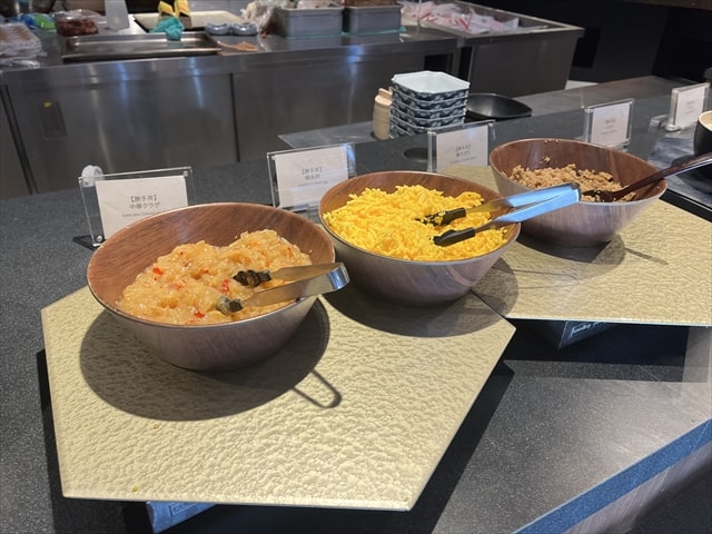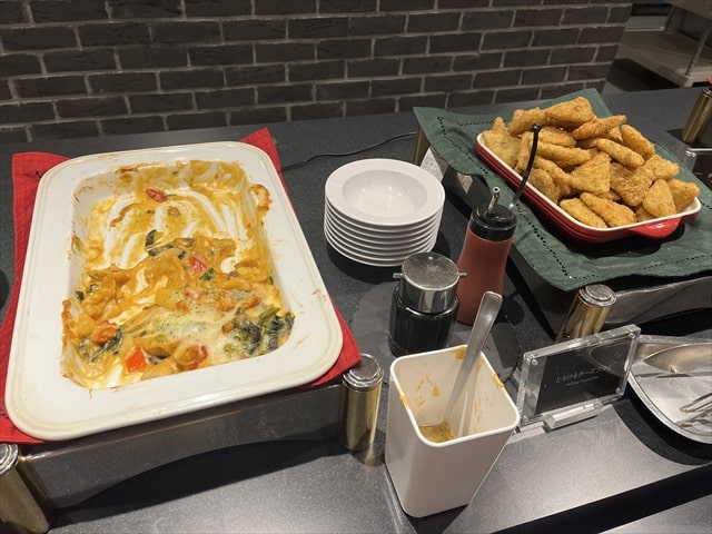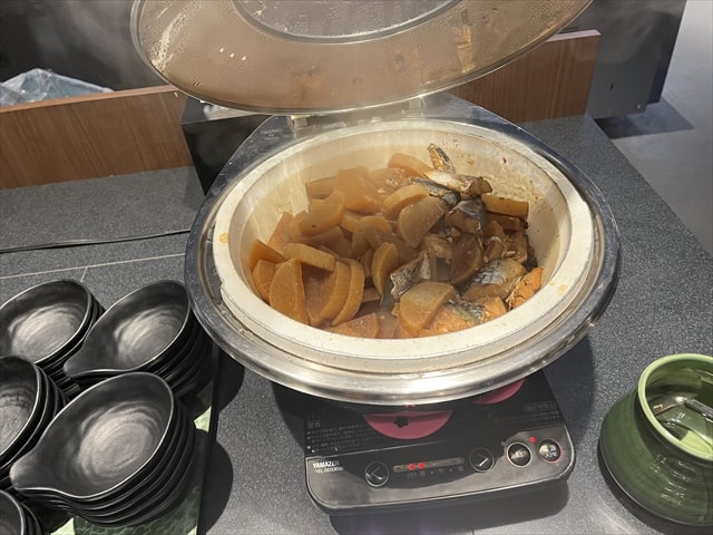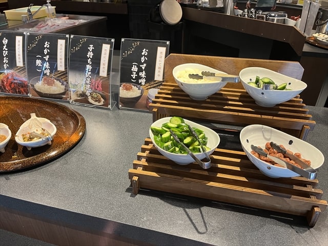 干物やフレンチトースト、魚と大根の煮付け、さつま揚げ、わかめ酢、出汁巻き玉子、温泉卵、焼き立てチョコデニッシュ、デニッシュ、シリアル、離乳食、カットフルーツなどもありました。