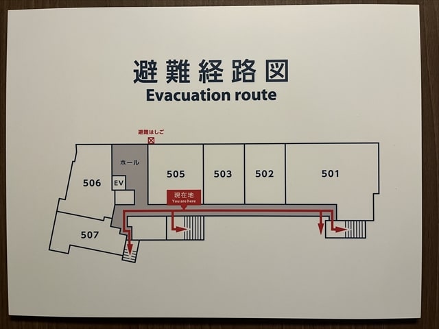 宿泊したのは最上階の501号室ですが、5階の避難経路図を見て頂くとわかる様に2人ではとても広い部屋となっています。