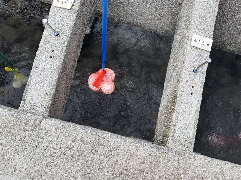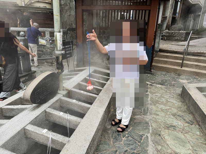 そしてタマゴを湯壺に入れるのですが、湯壺は2か所ありお湯の温度が違いますので、高温の方にタマゴを入れますと10分から11分で出来上がると教えてくれます。
