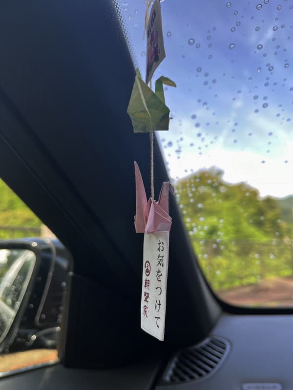 また車のフロントウインドーにはかわいい手作りの千羽鶴のお守りが飾られていて、心遣いがすごいと思わせてくれました。