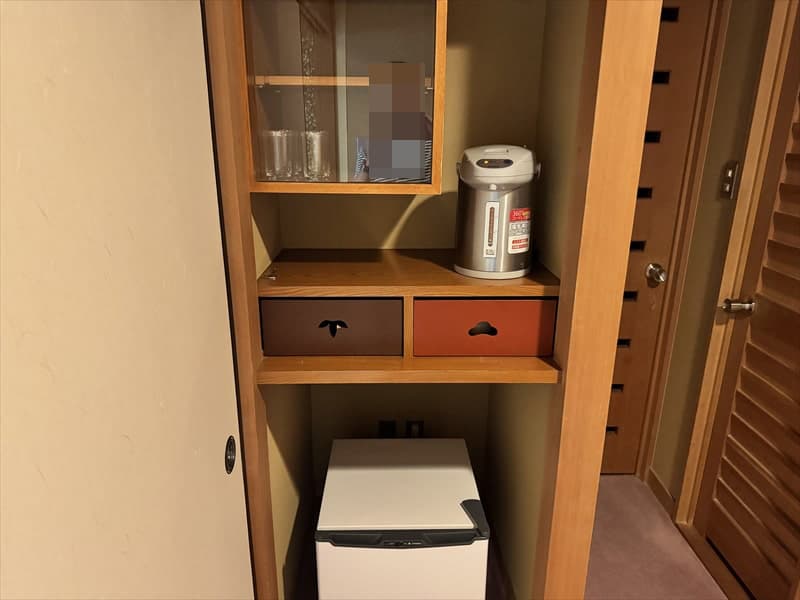 お茶請けがテーブルの上に置かれていましたし、お茶セットも置かれていてお湯は電気ポットに用意されていますので自分でお茶は入れます。