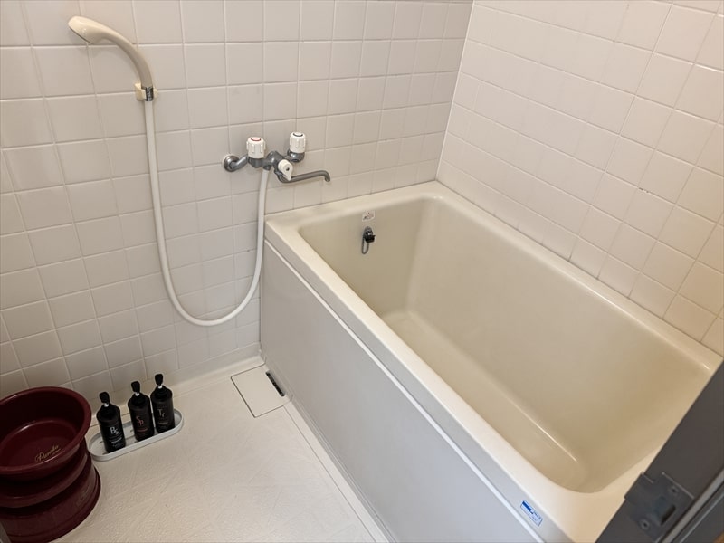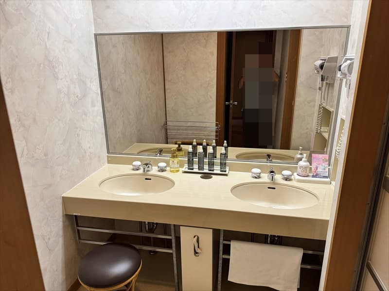 洗面台は2ボウルですから便利でしたし、お風呂はポリバスですが蛇口からは温泉が出てきますので、部屋で源泉かけ流しの温泉を楽しむこともできます。