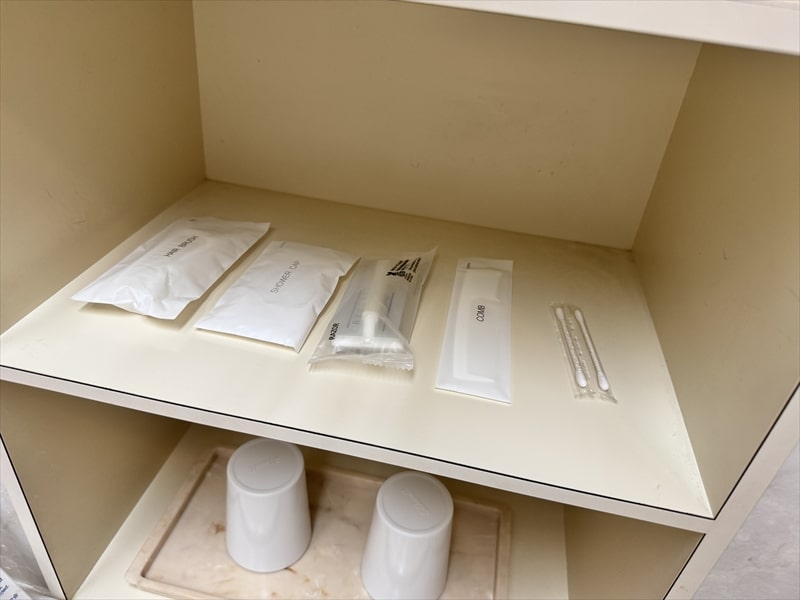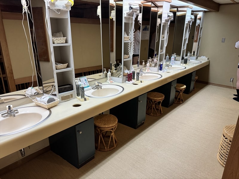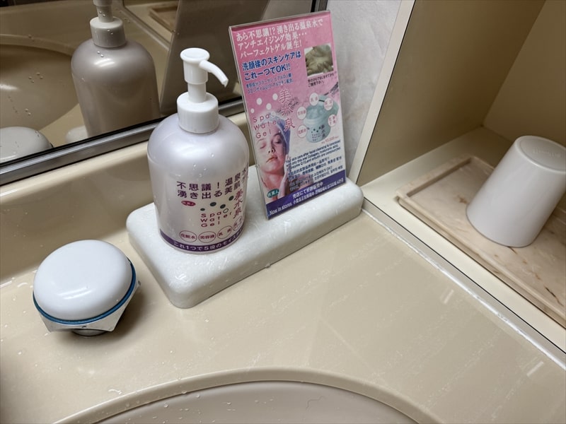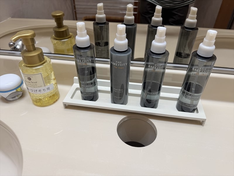 アメニティは洗面所にはクシ、ブラシ、シャワーキャップ、髭剃り、綿棒がありましたし、洗面台には温泉化粧水、スキンウオーター、スキンミルク、ヘアートニック、ヘアーリキッド、ハンドソープが置かれています。