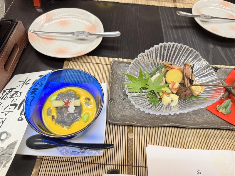 前菜:葛の花盛合せ 素麺南瓜甘酢漬 鹿肉メンチ 鰻白焼き 甘海老唐揚げ 松茸おろしポン酢