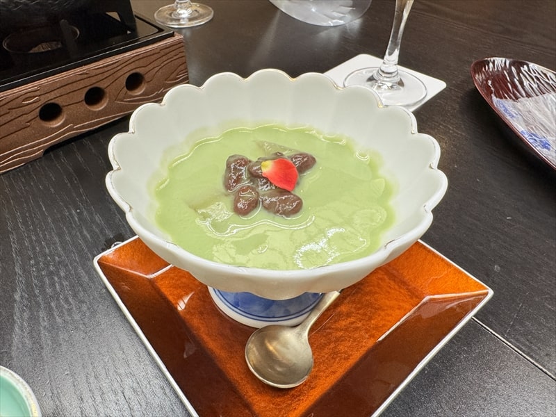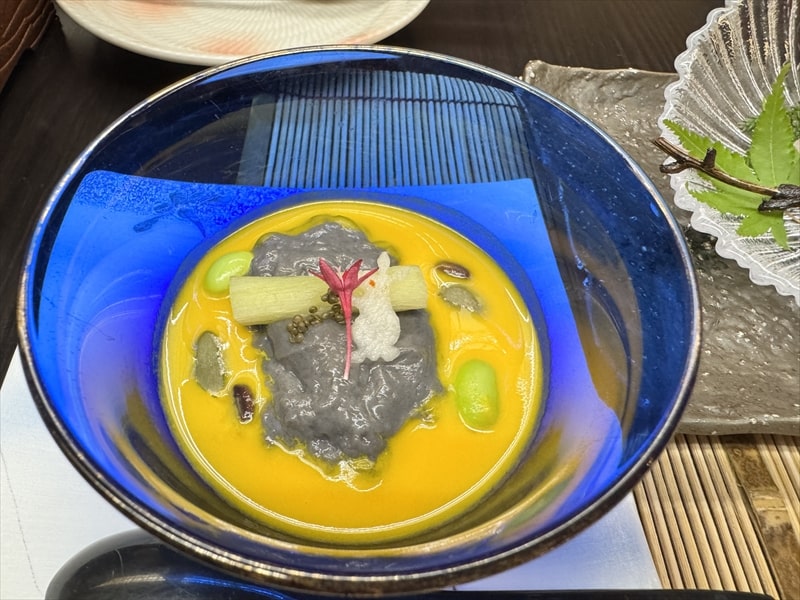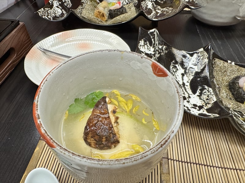 煮物椀:丸大豆と早松茸 早蕪すり流し 薄葛仕立 すっぽん豆腐巾着 焼松茸
