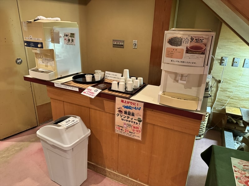 大浴場の前では冷たい抹茶と黒豆茶のサービスも午後7時まで行われていました。