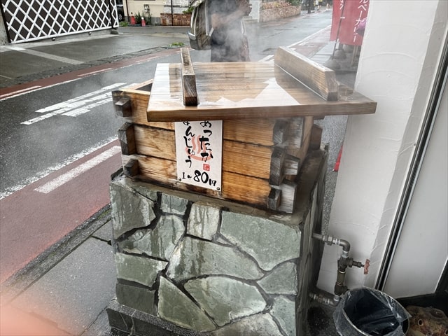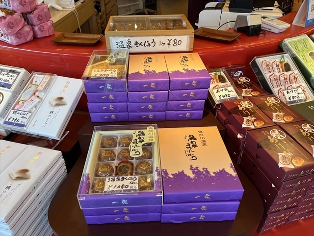 出来立ての温泉まんじゅうをホテルや駅前の土産店で買うことができます。