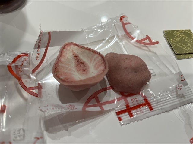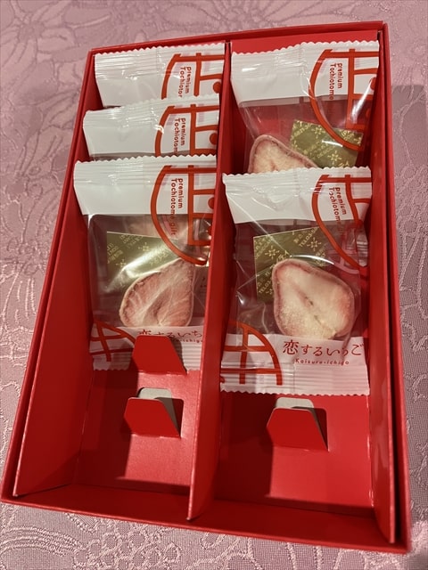 とちおとめ日本1の産地の栃木県真岡市のイチゴをフリーズドライしてホワイトチョコレートでコーティングしたものです。
