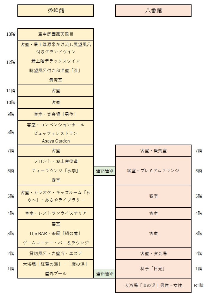 秀峰館の13階には空中庭園露天風呂の昇龍の湯があり、8階にはビュッフェレストランのASAYA GARDEN、4階には和彩工房、1階には大浴場の麻の湯と紅葉の湯があります。