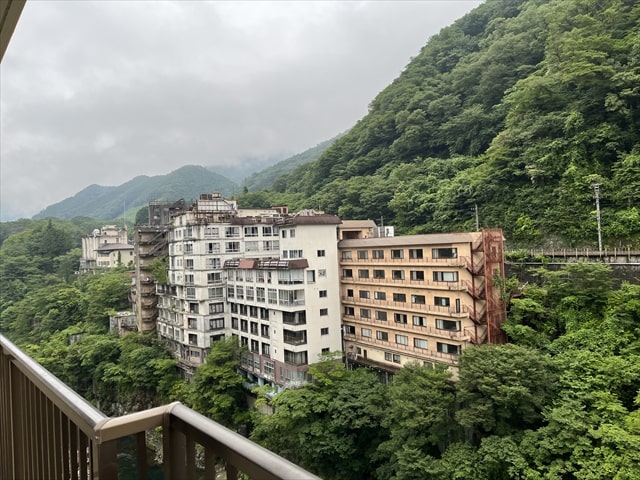 渓谷側の眺望は鬼怒川と東武鬼怒川線の車両と、鬼怒川名物の廃墟ホテルを楽しむことができます。
