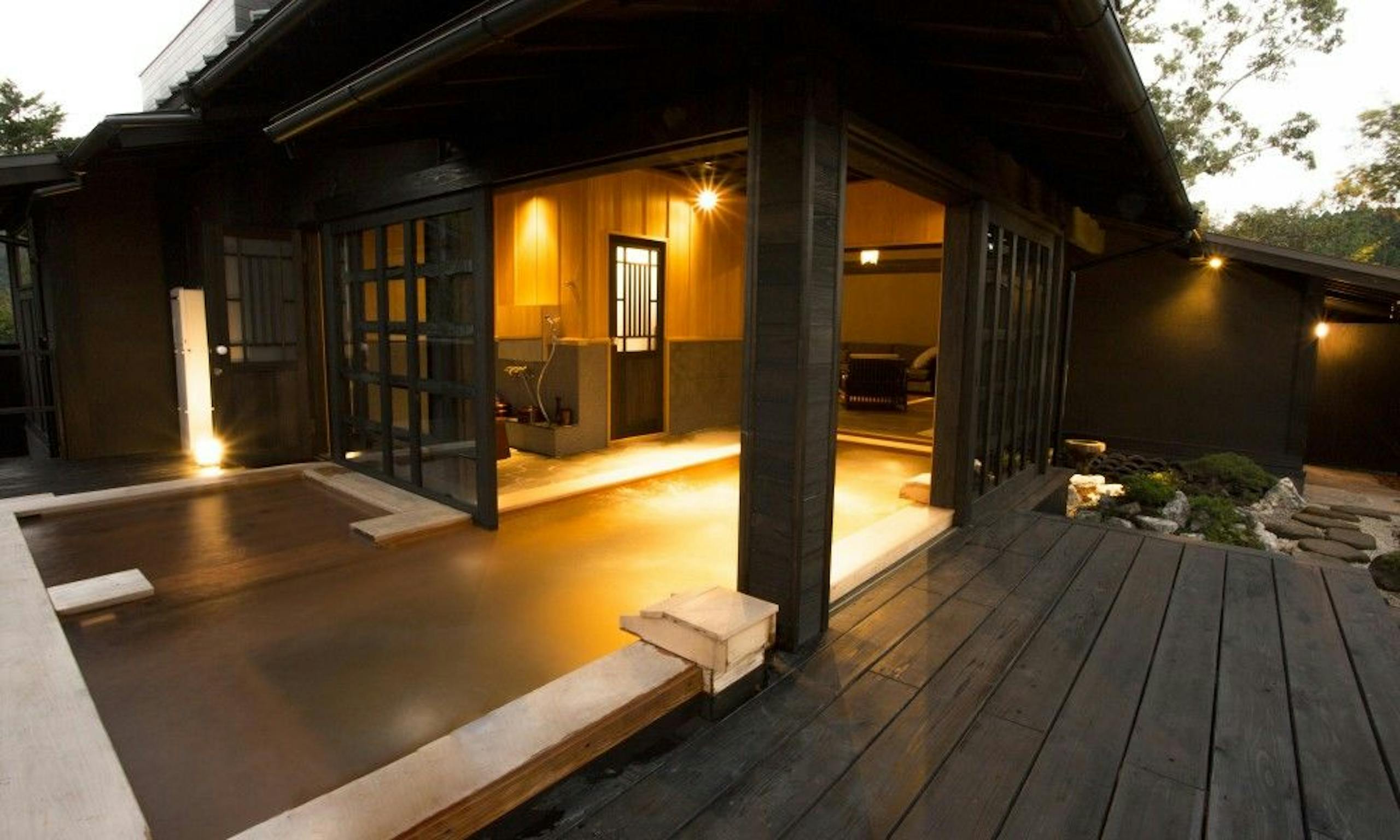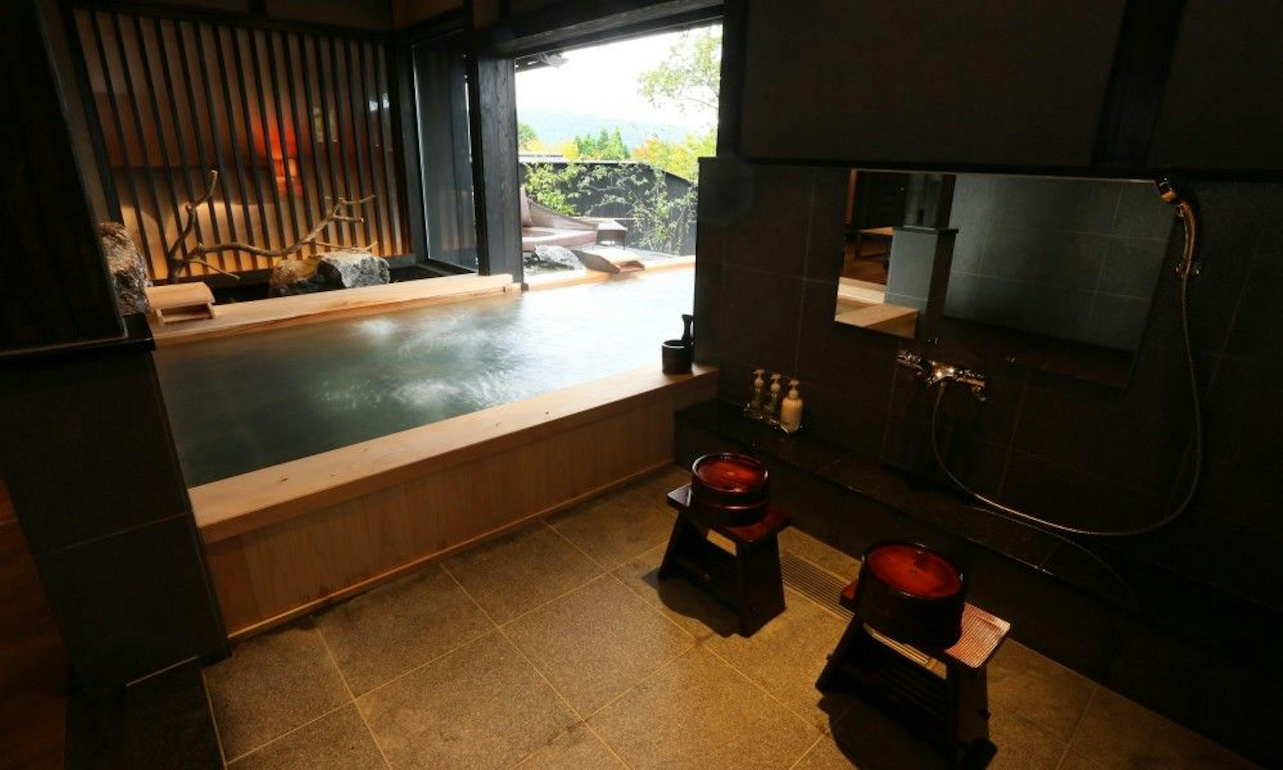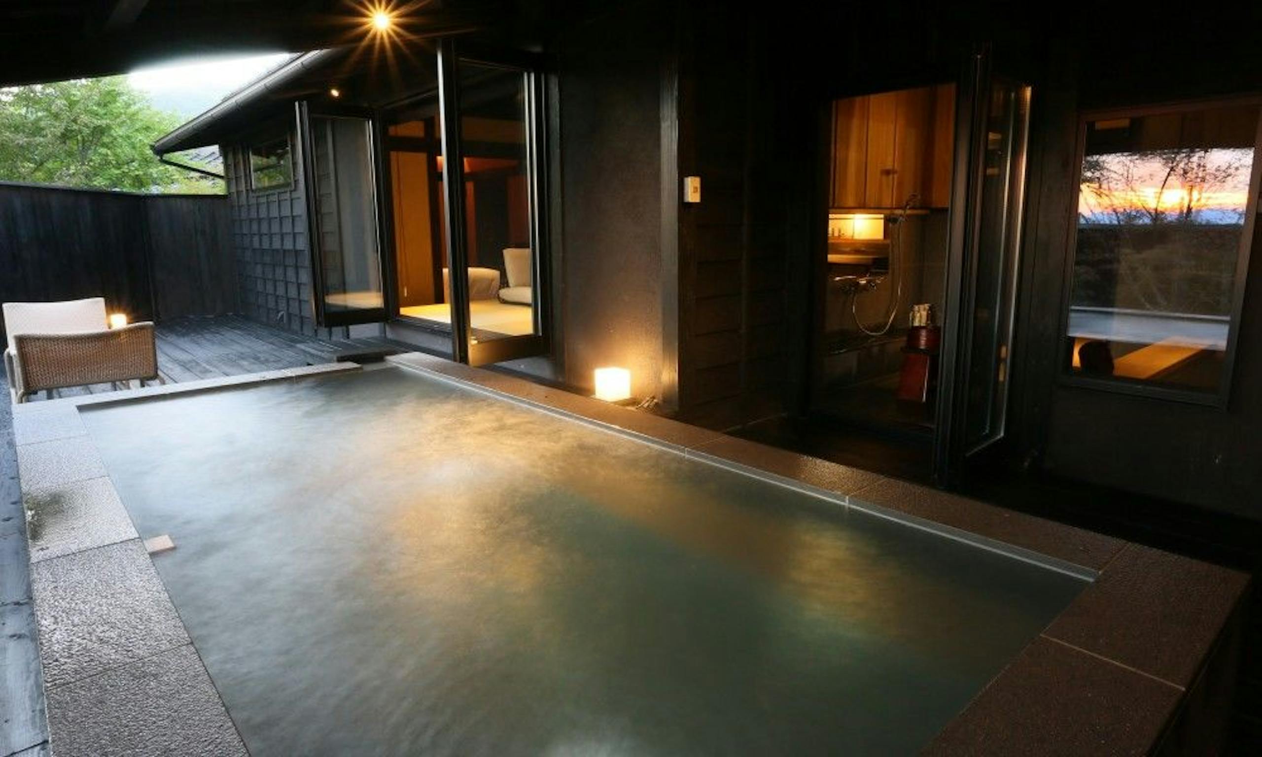 畳スペース・ツインベッドルーム・リビング+囲炉裏+檜内風呂+檜露天風呂+洗面所+トイレ+月見台