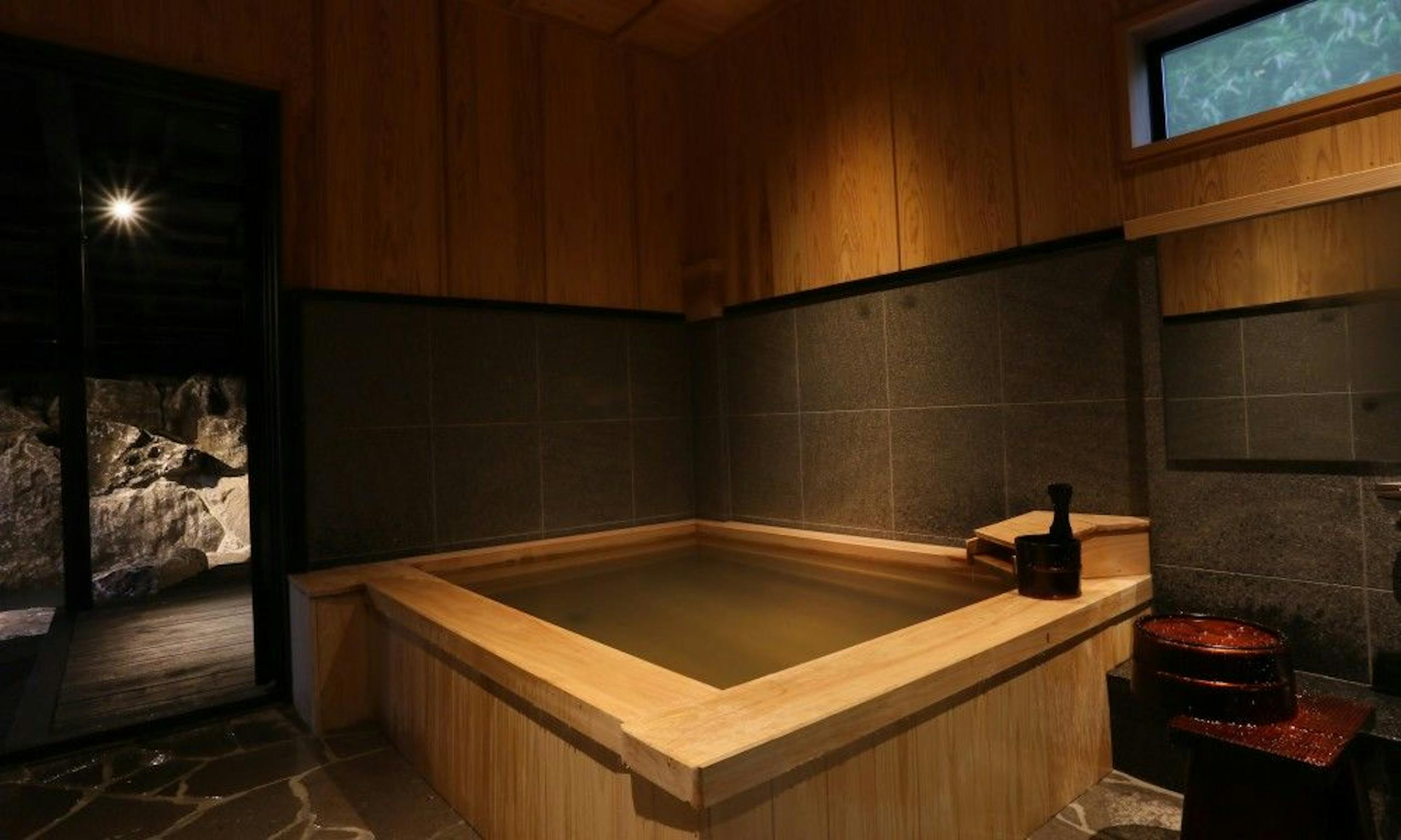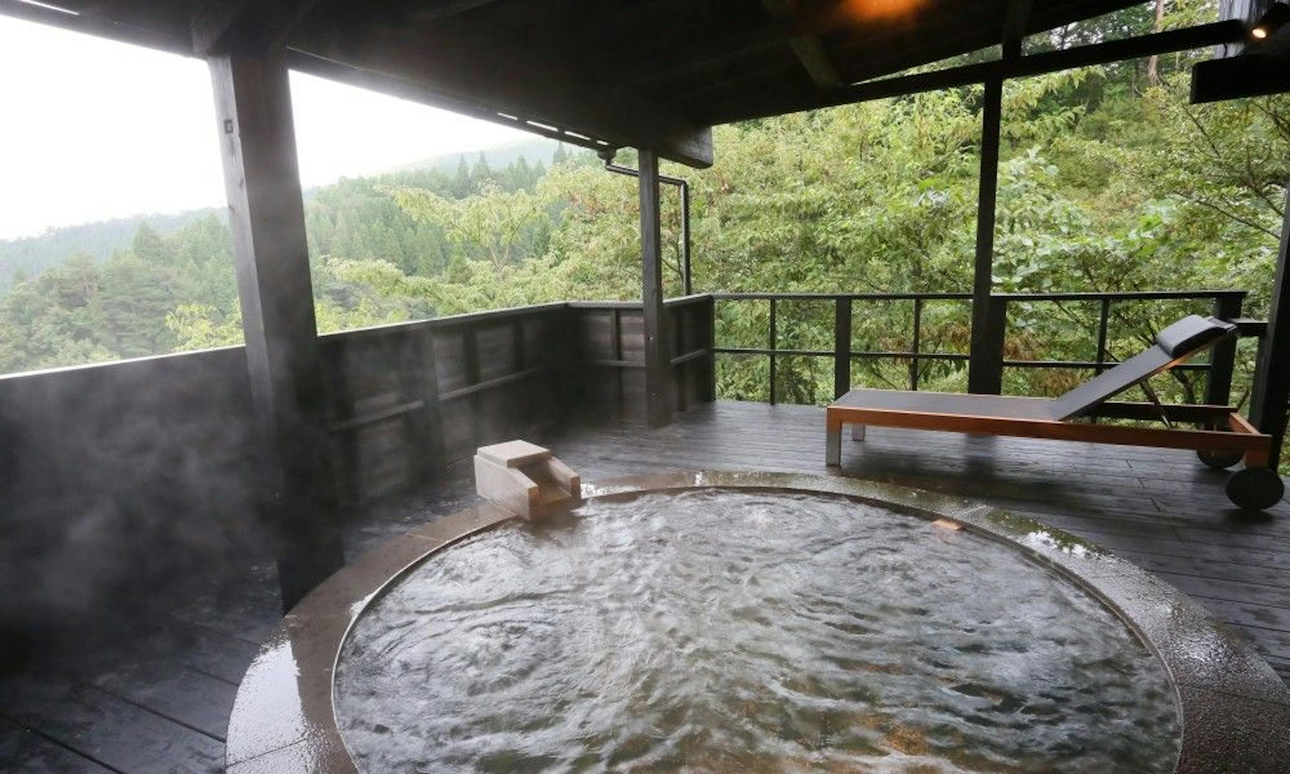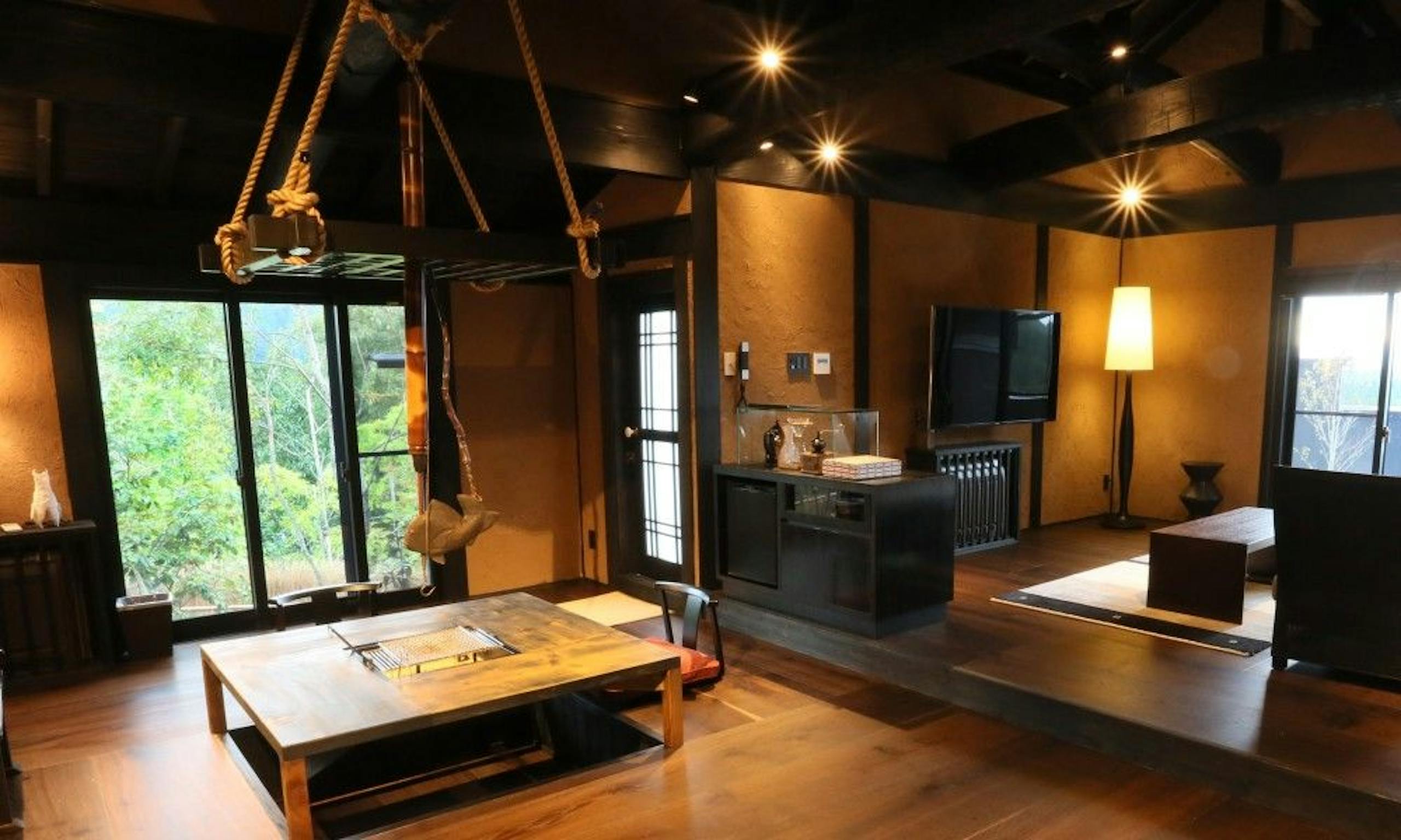 畳スペース・ツインベッドルーム・リビング+囲炉裏+檜内風呂+檜露天風呂+洗面所+トイレ+月見台
