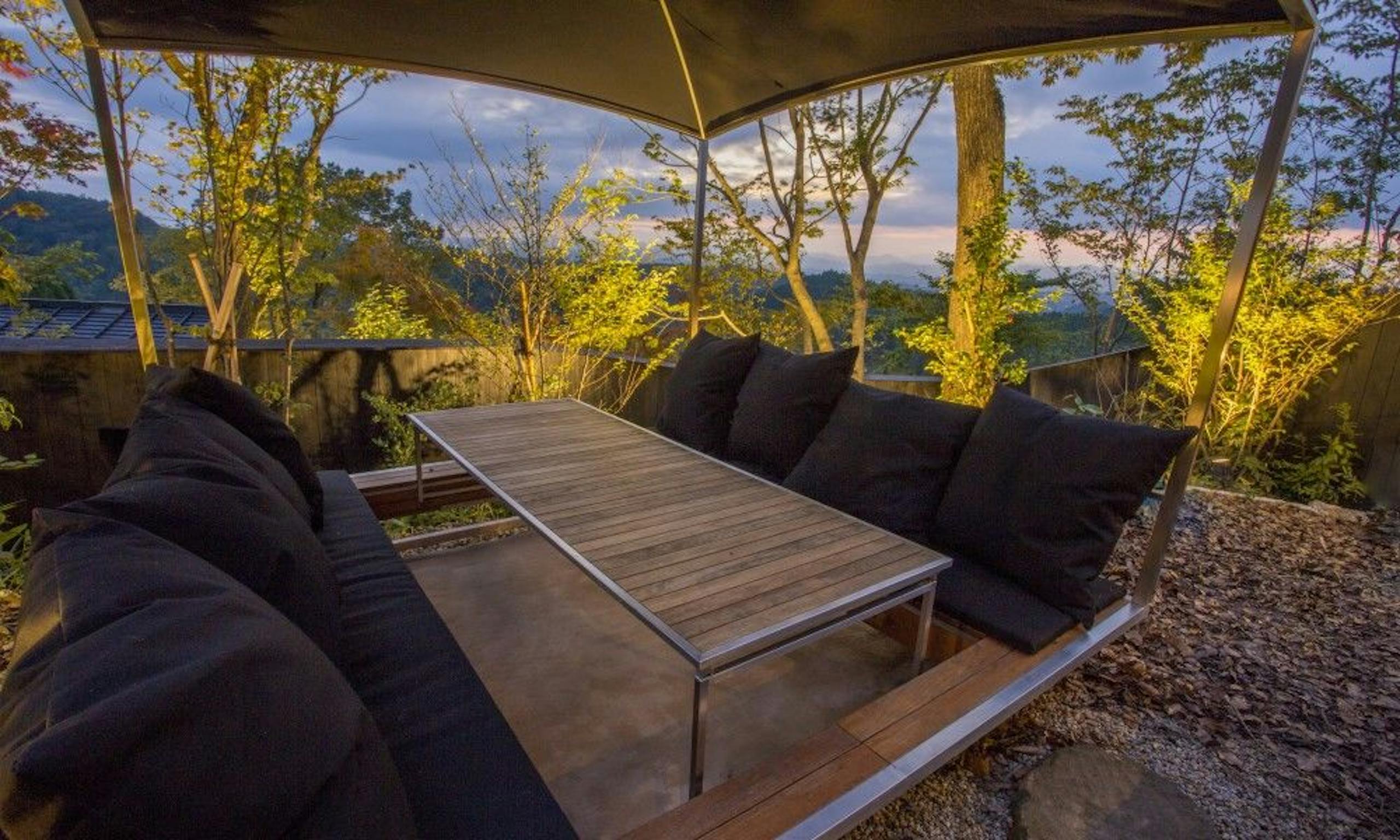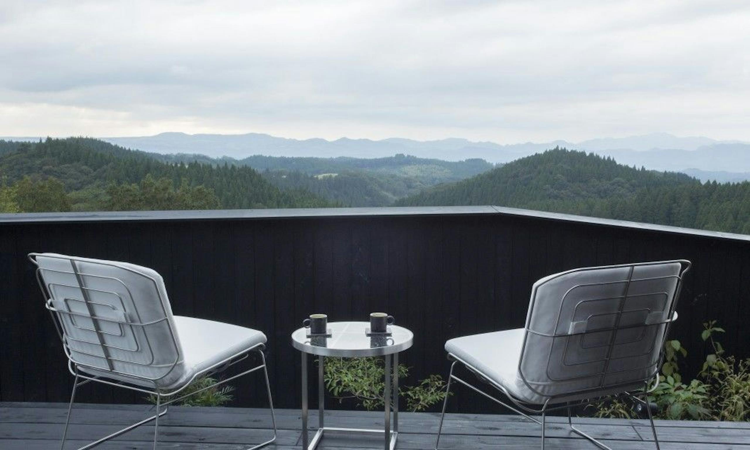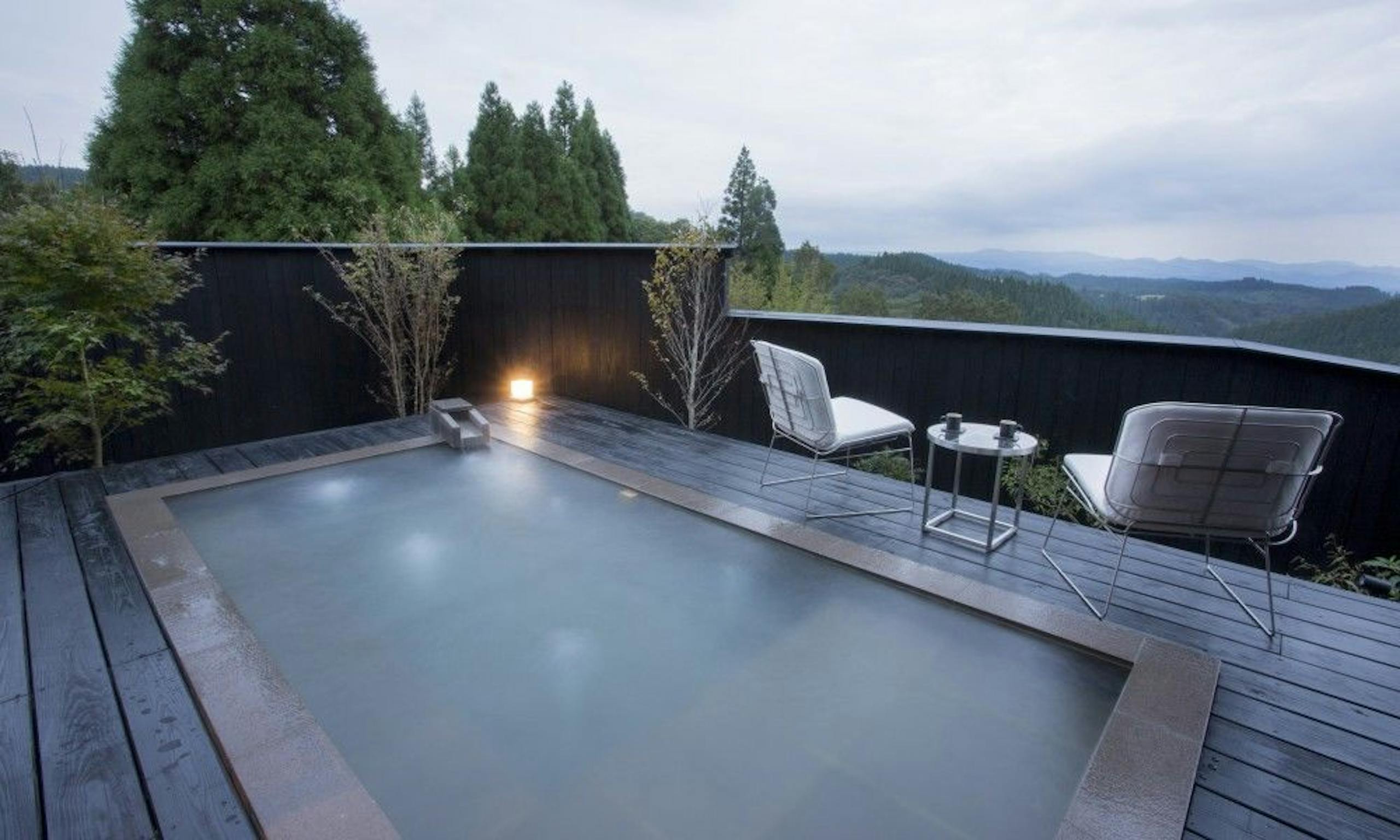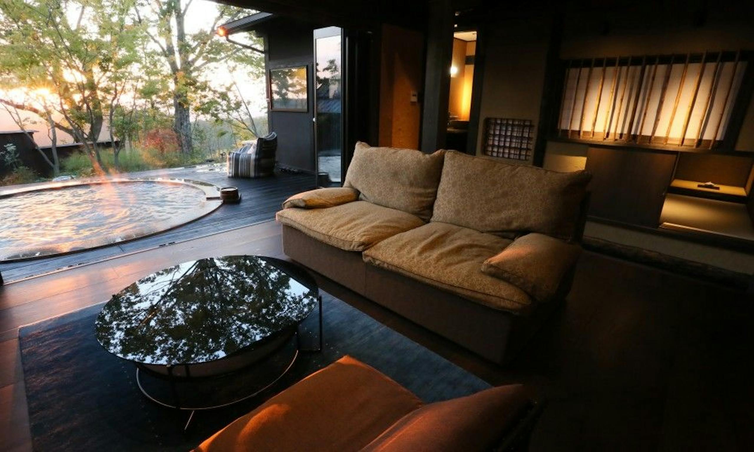 リビング正面が露天風呂で、暖かい日だったので大きな扉を開け放って湯煙と阿蘇の山並を眺めながら寛ぐことができました。