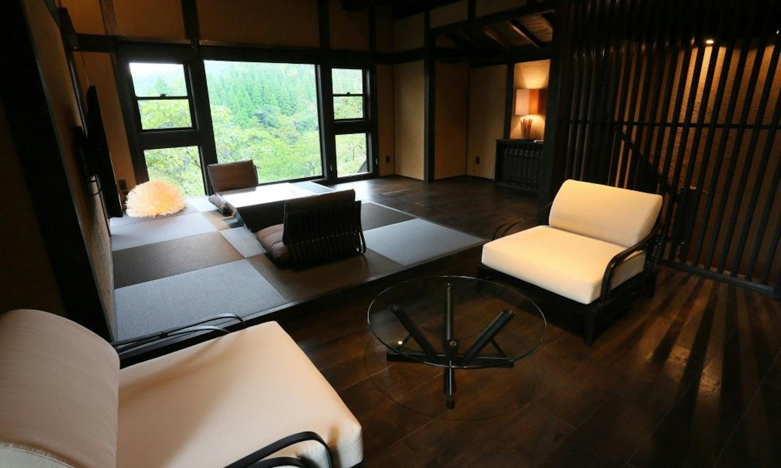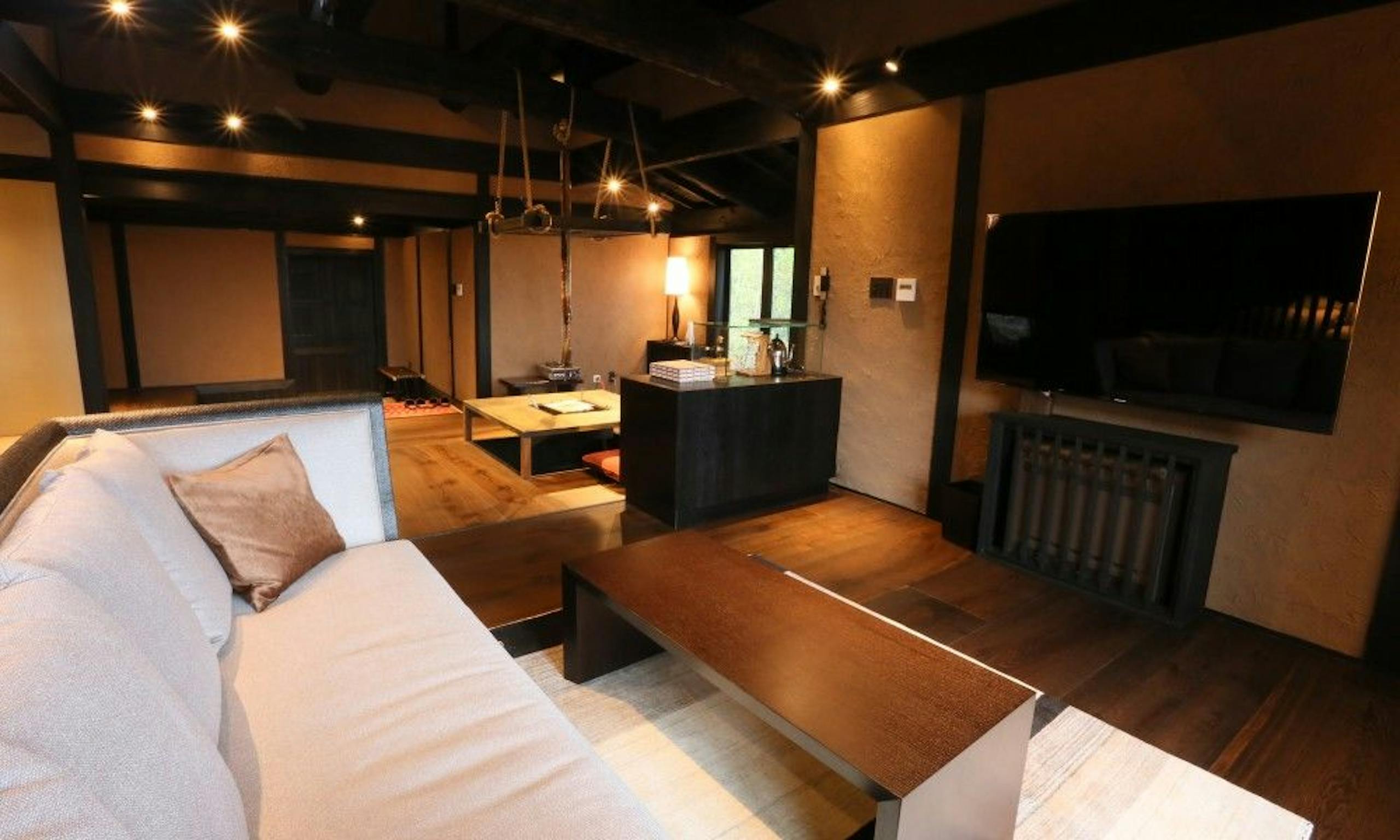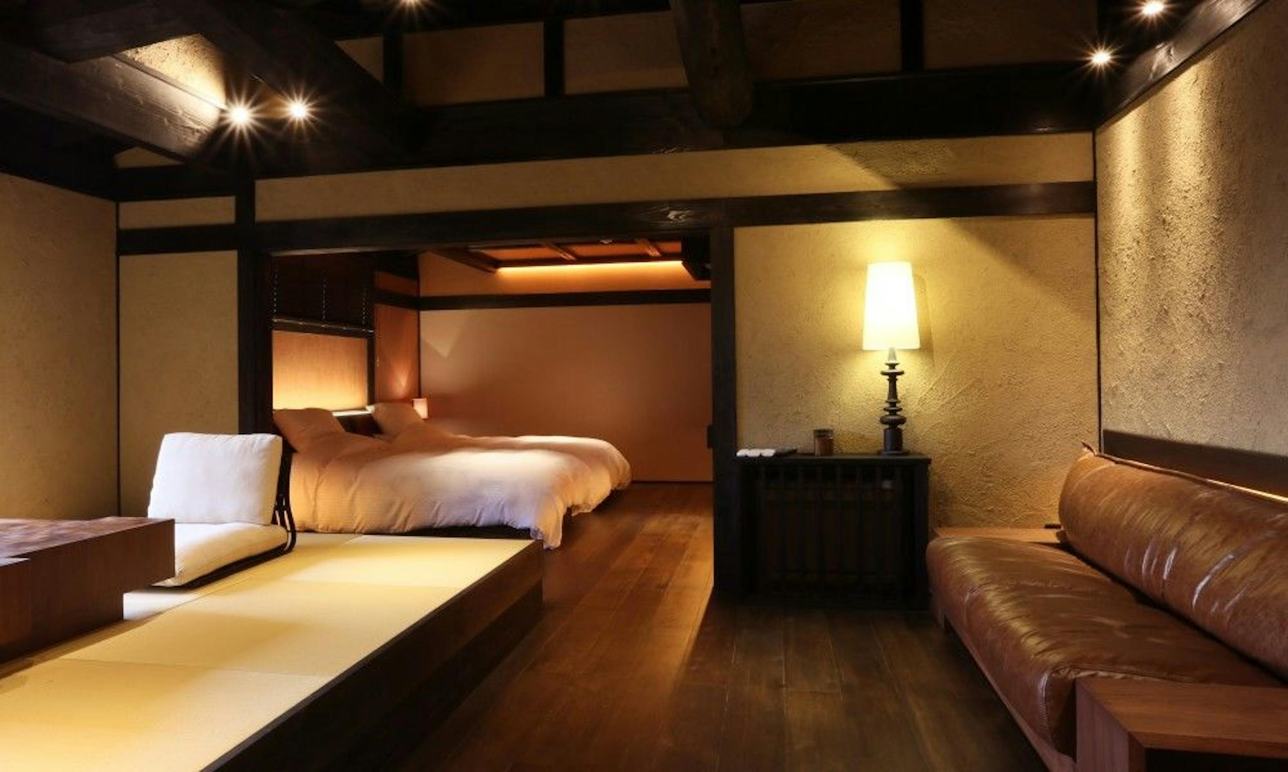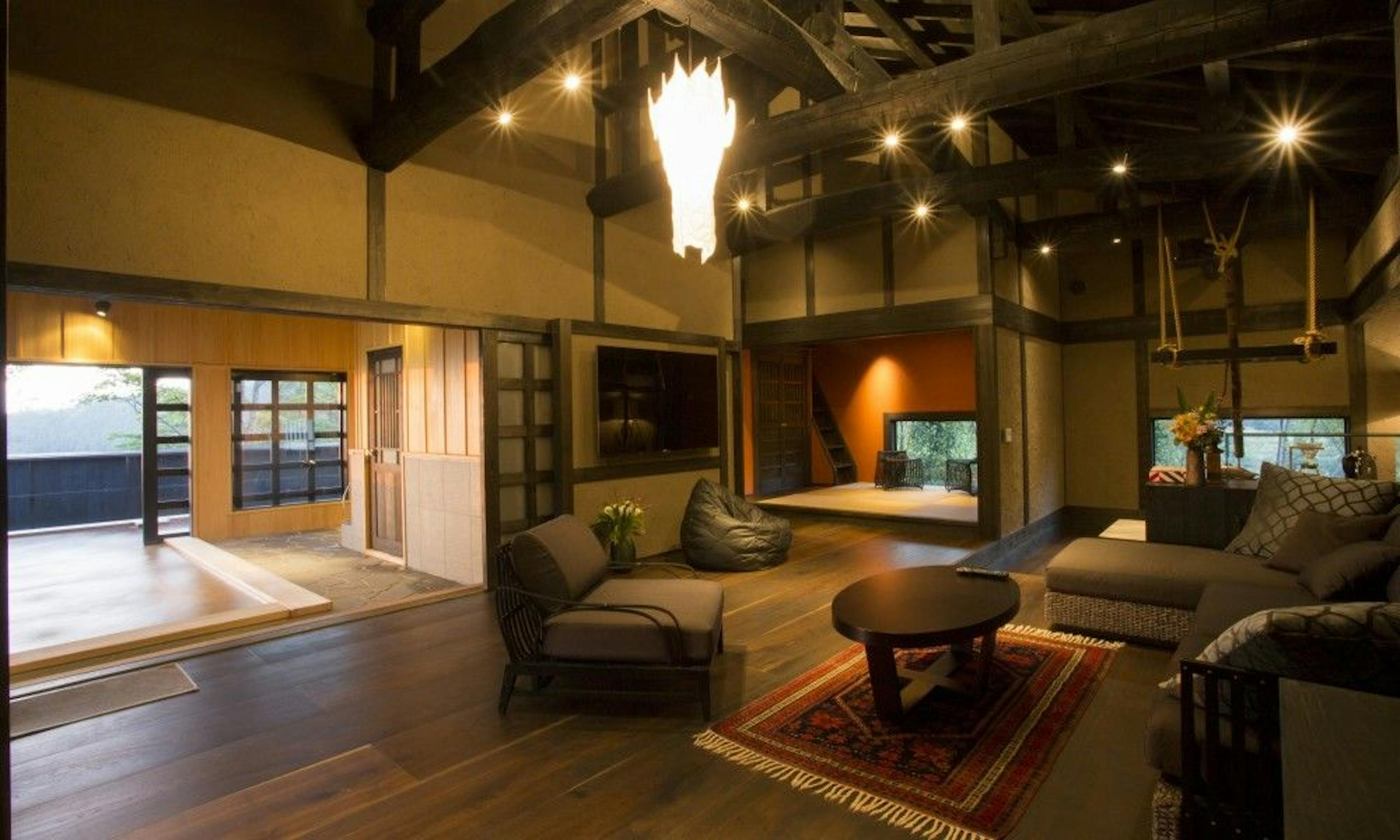 畳スペース・ツインベッドルーム・リビング+茶室+囲炉裏+檜内風呂+円形露天風呂+洗面所+トイレ