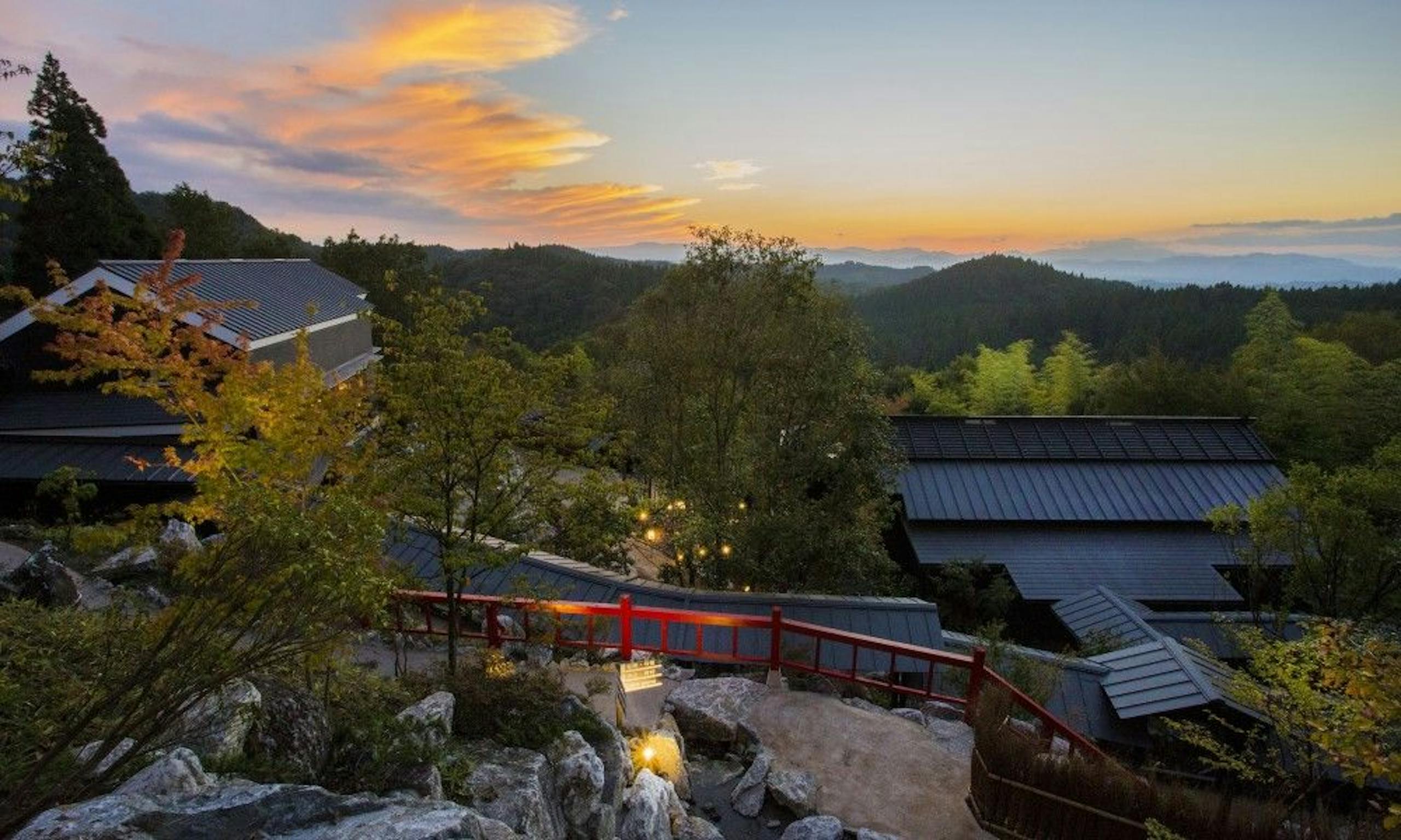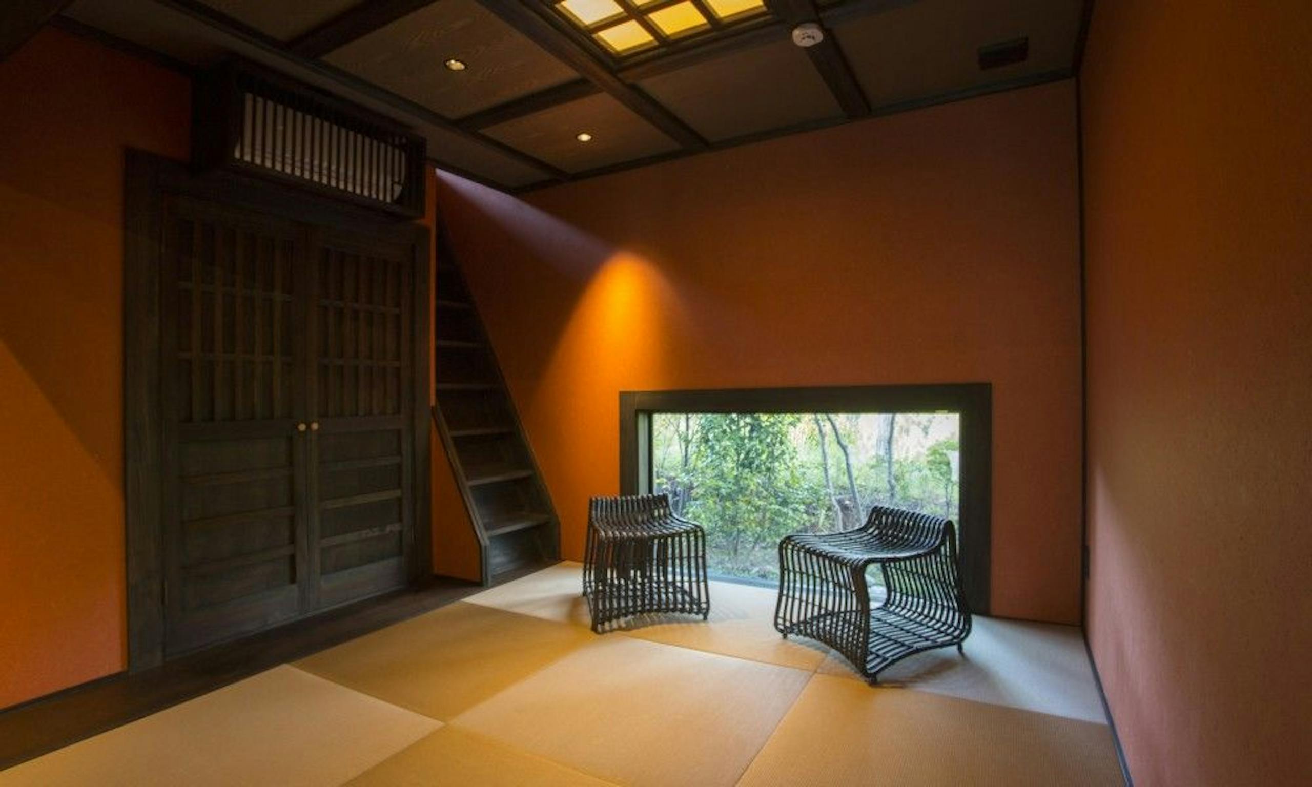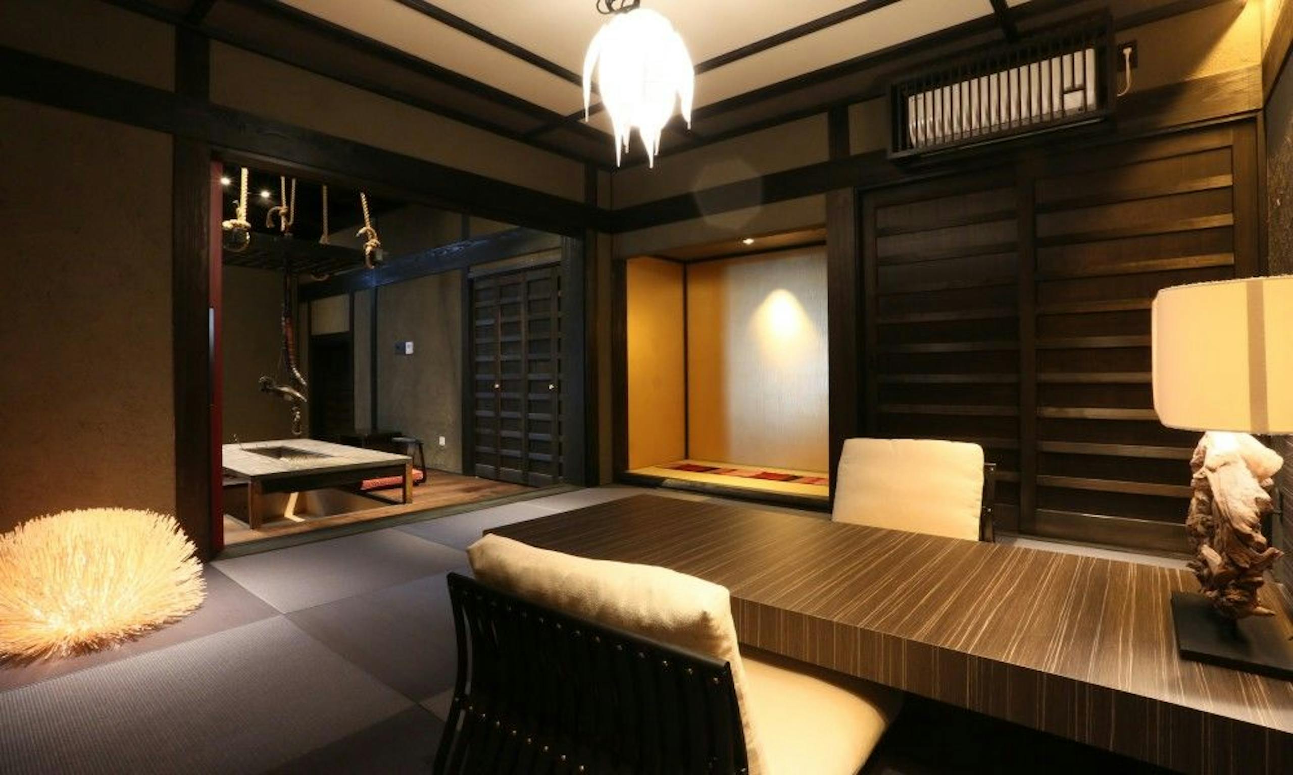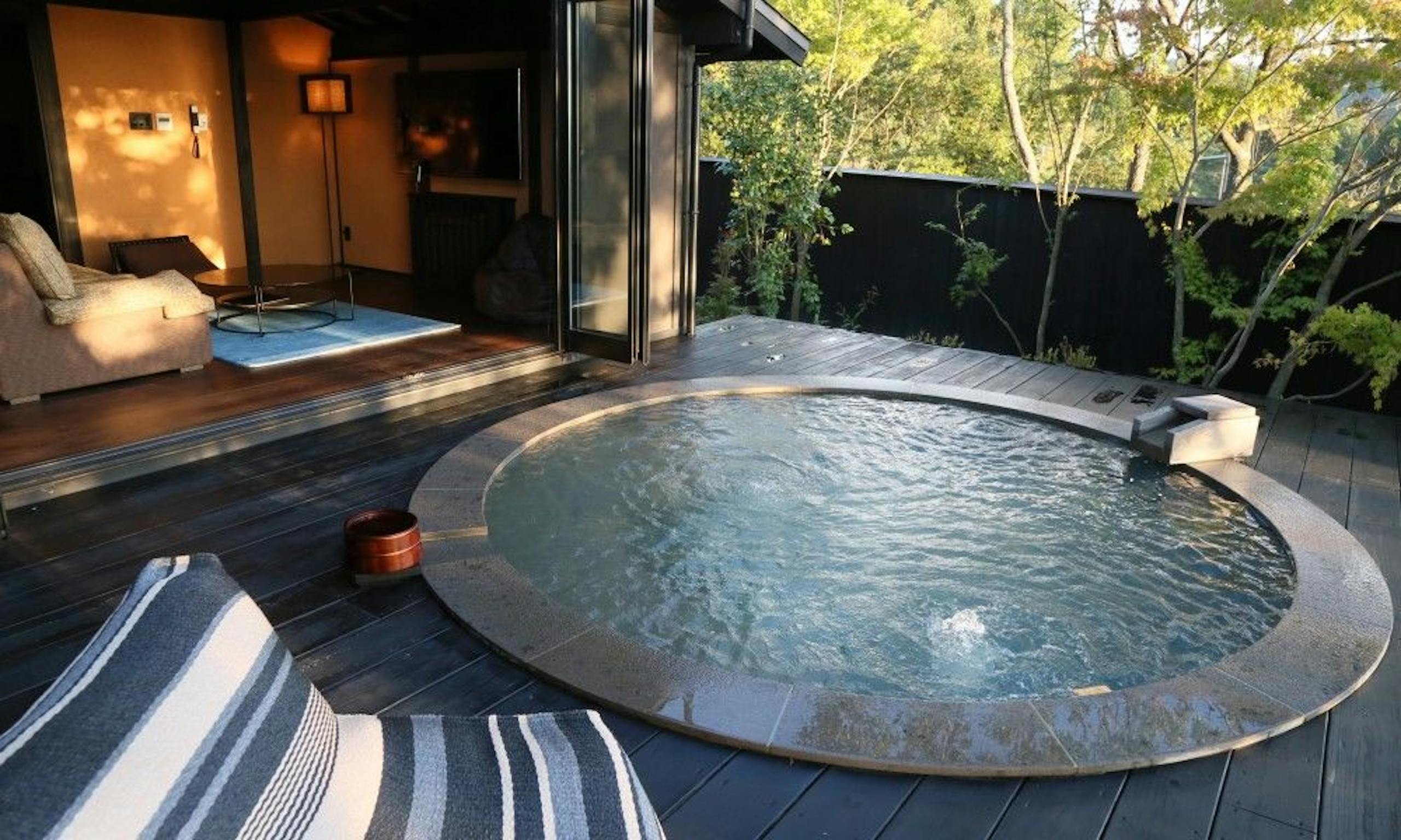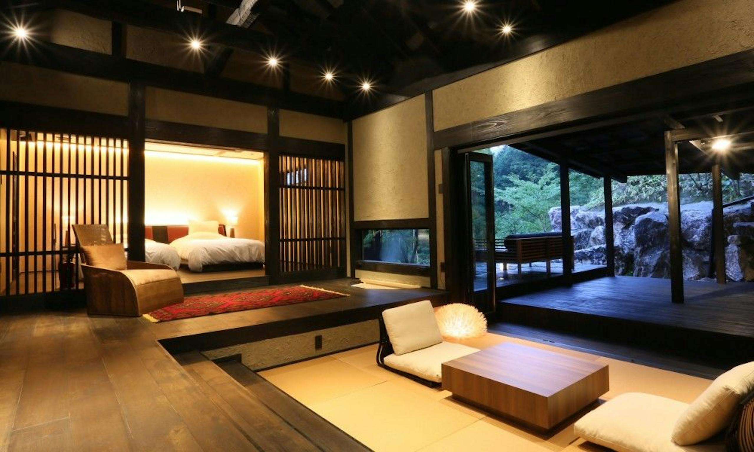畳スペース・ツインベッドルーム・リビング+茶室+囲炉裏+檜内風呂+円形露天風呂+洗面所+トイレ