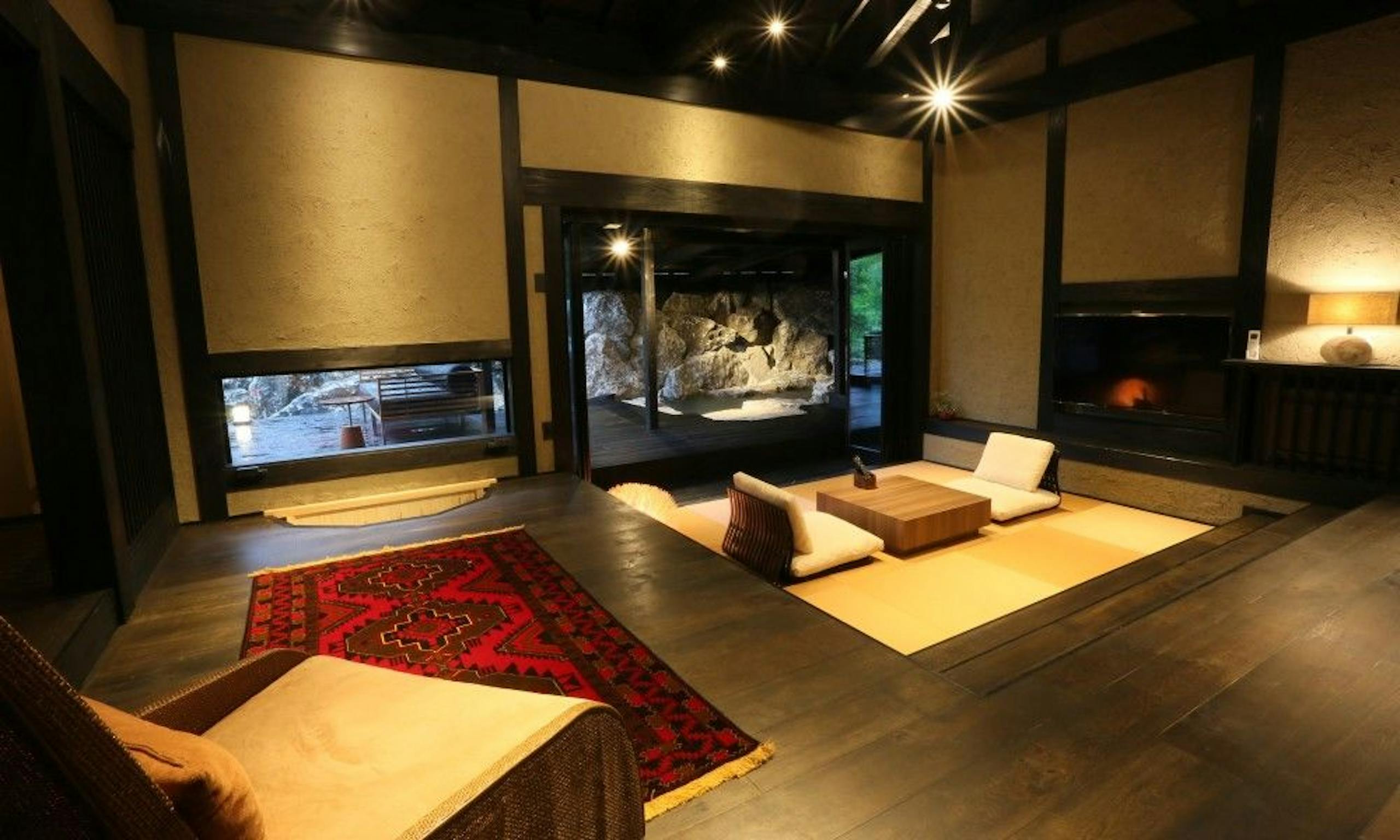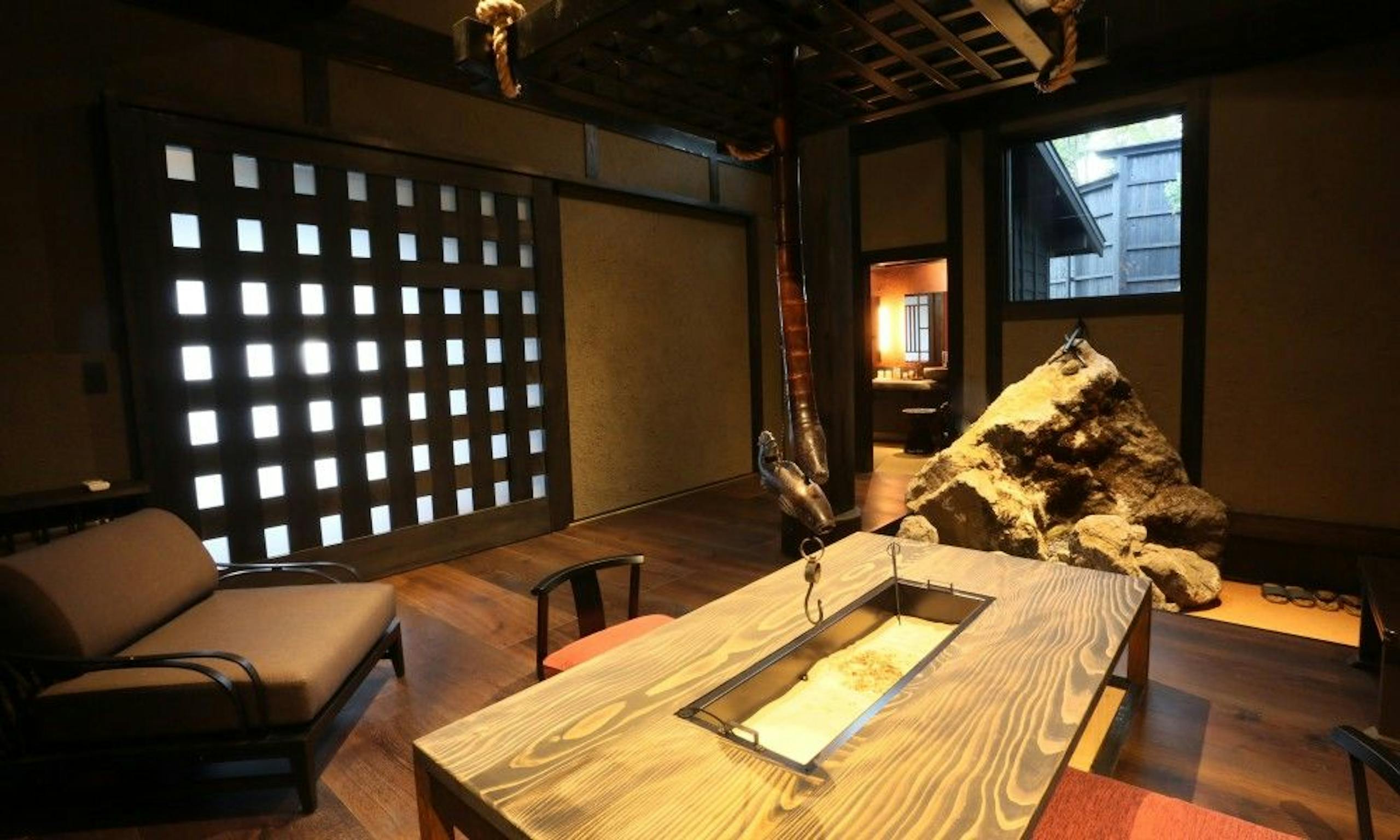 畳スペース・ツインベッドルーム・リビング+囲炉裏+檜内風呂+切石露天風呂+洗面所+トイレ