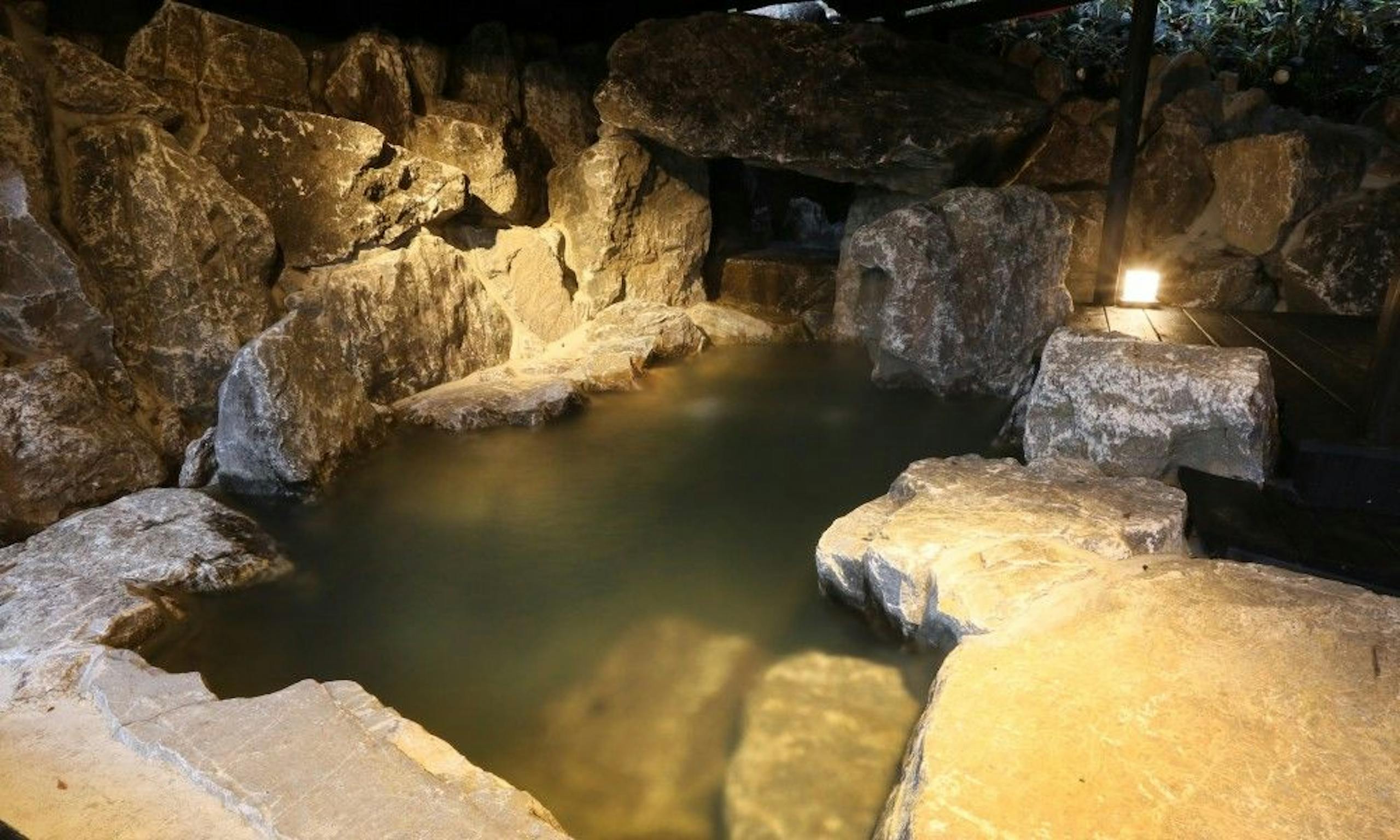 畳スペース・ツインベッドルーム+囲炉裏+檜内風呂+洞窟風露天風呂+洗面所+トイレ