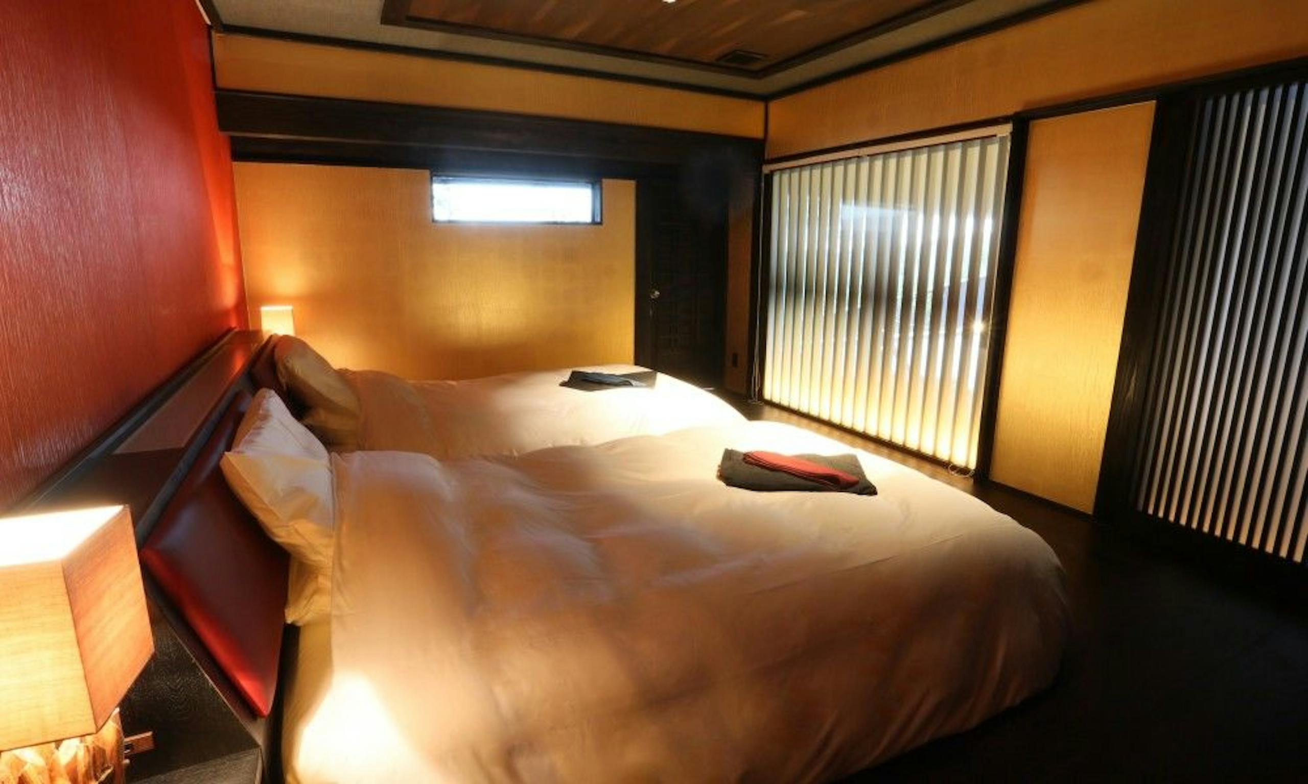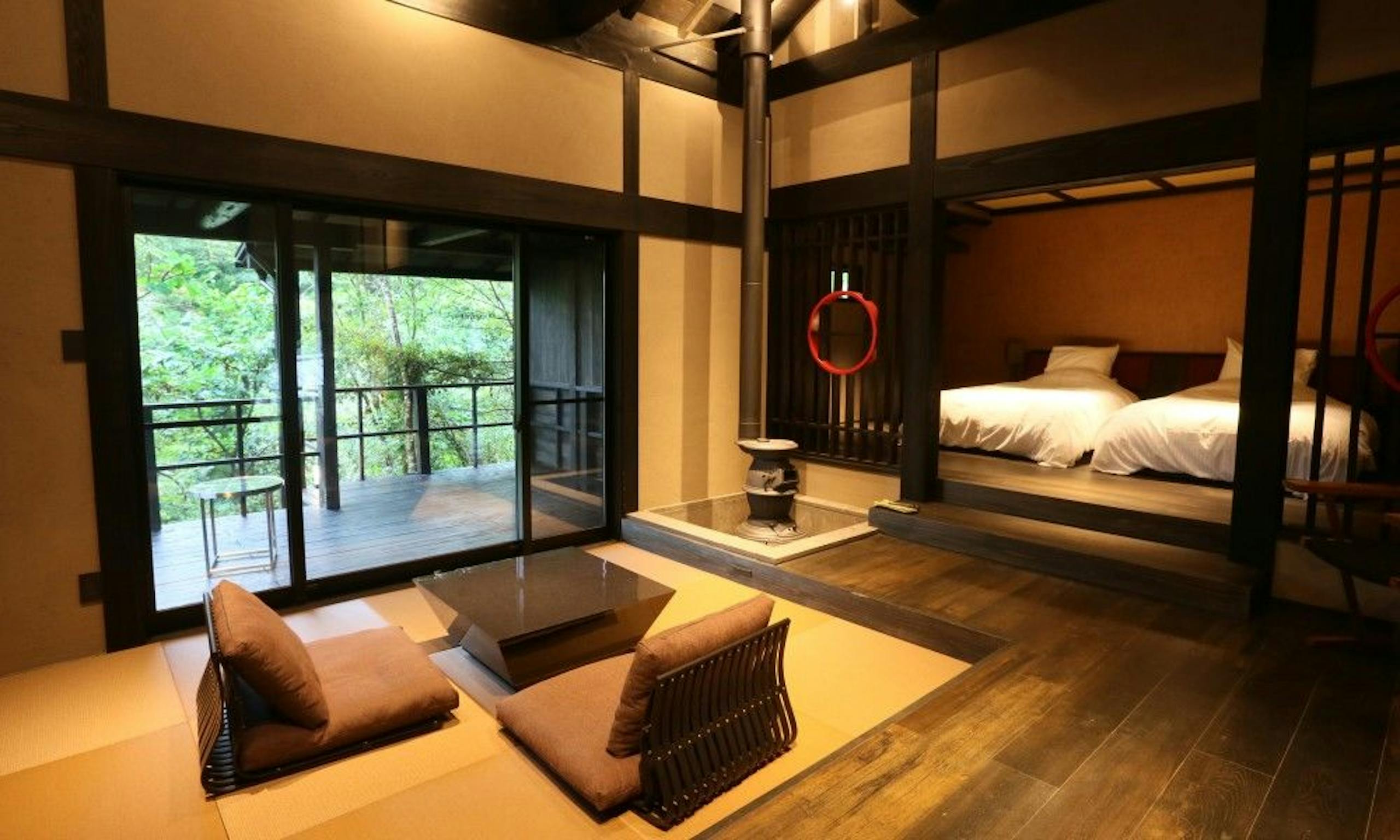 畳スペース・ツインベッドルーム+囲炉裏+檜内風呂+檜露天風呂+洗面所+トイレ