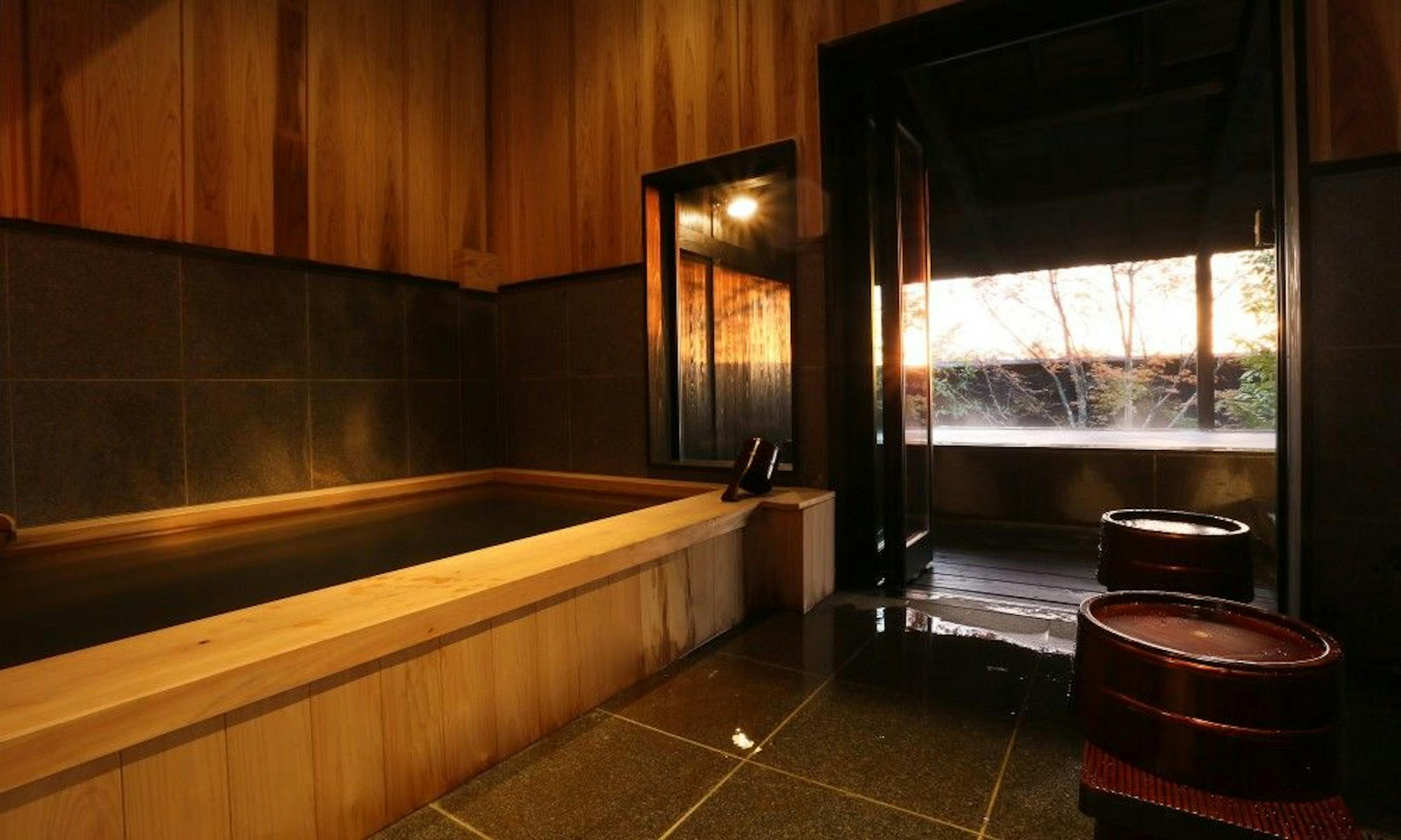 畳スペース・ツインベッドルーム+囲炉裏+檜内風呂+円形露天風呂+洗面所+トイレ