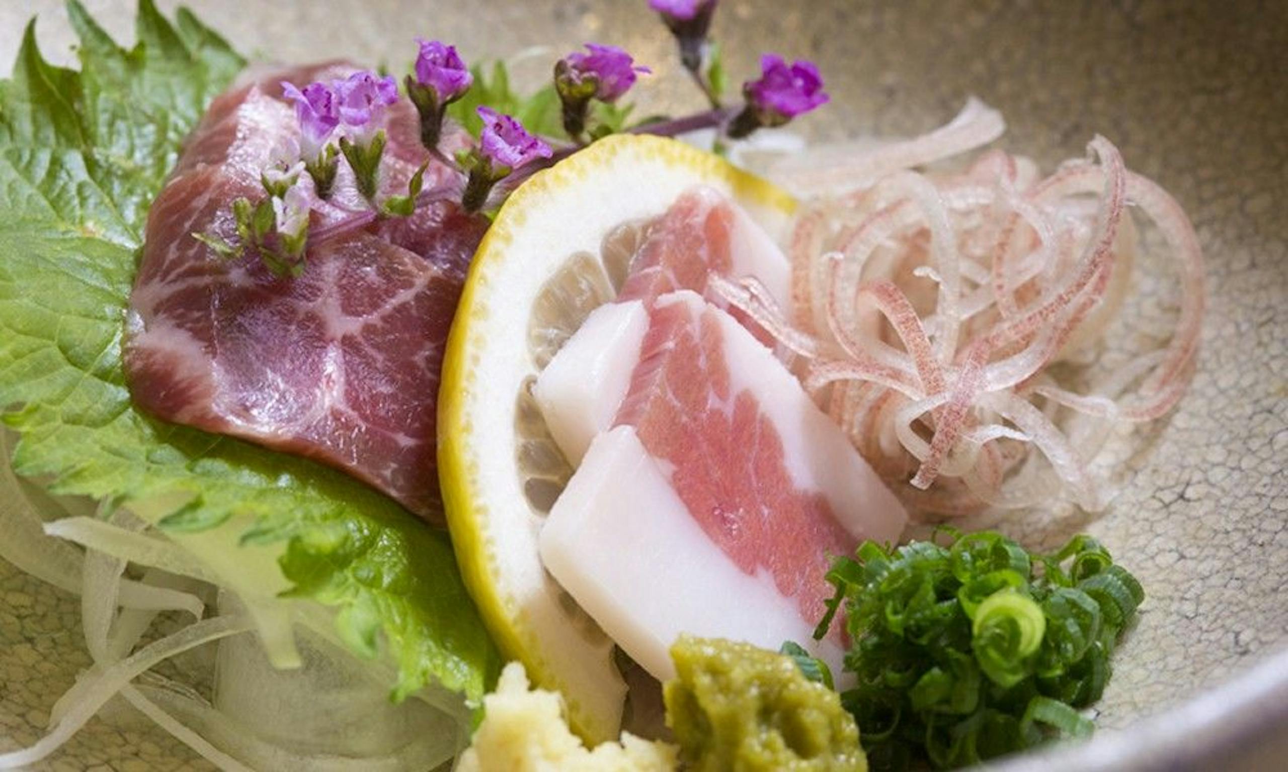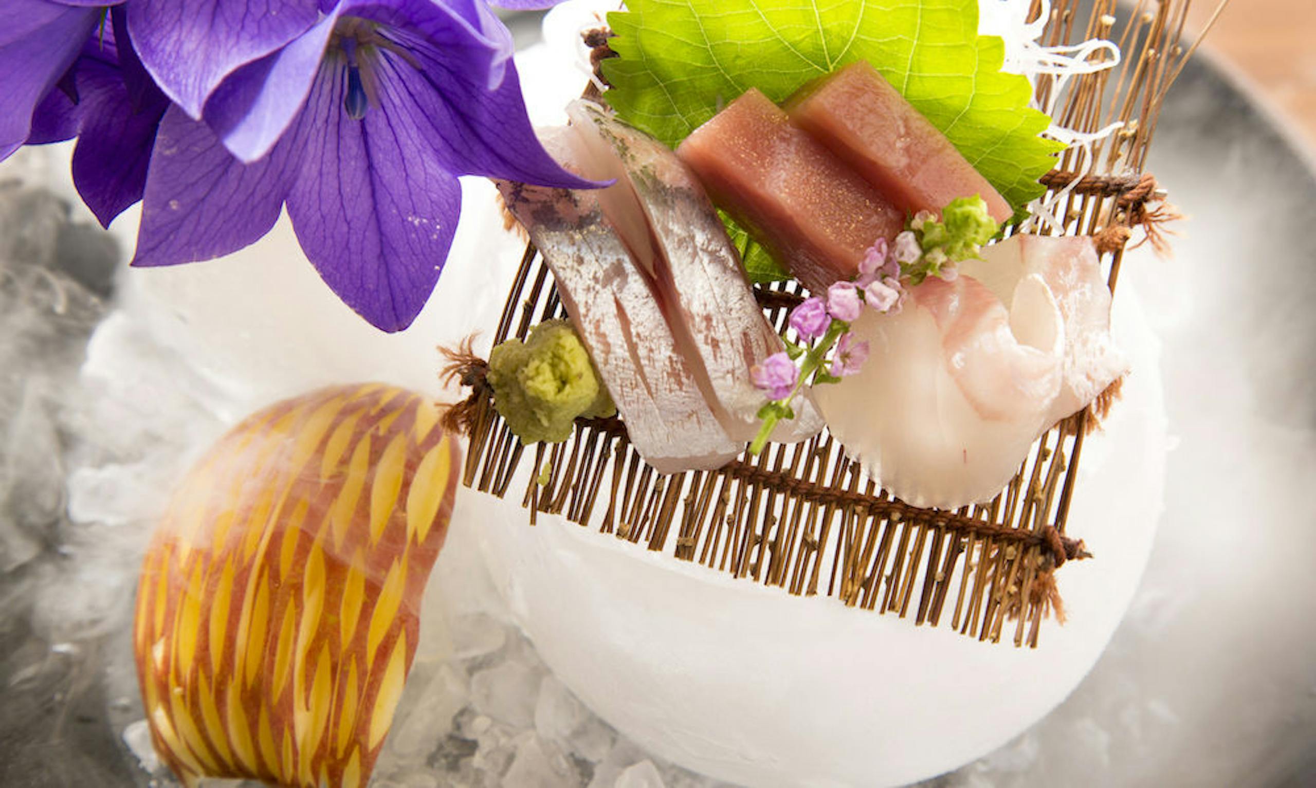 割鮮: 白身魚重ね造り 伊勢海老 鮑 中とろ 配らい一式 熊本の馬刺し 生姜 柚子胡椒