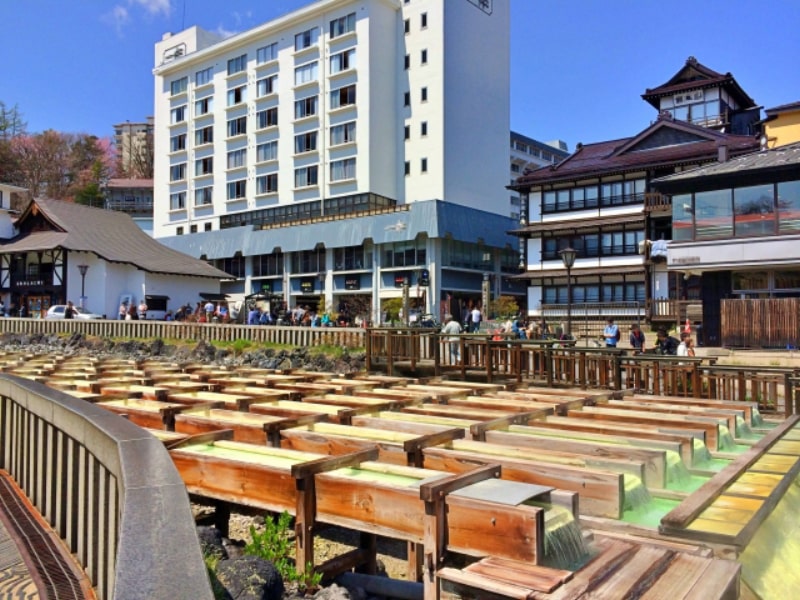 温泉の源泉は目の前にある湯畑となっていて、泉質は酸性・含硫黄・アルミニウム・硫黄塩・塩化物温泉となります。