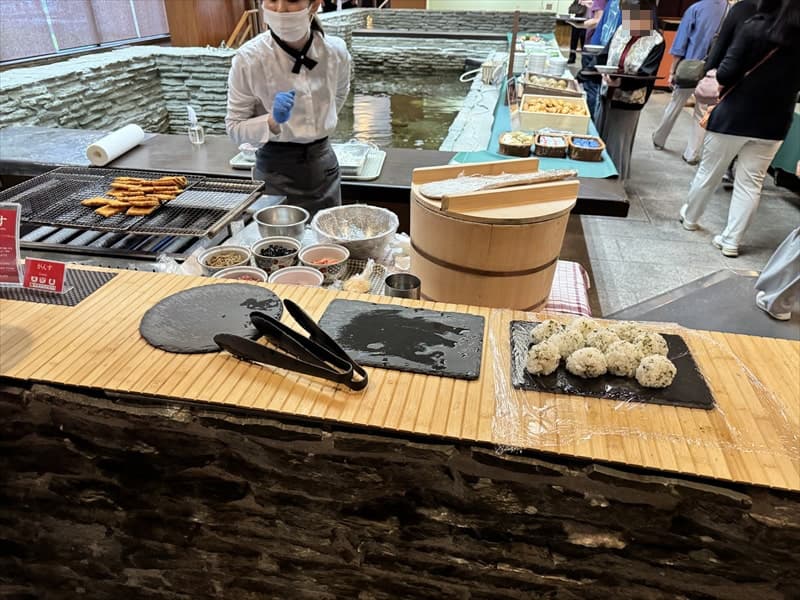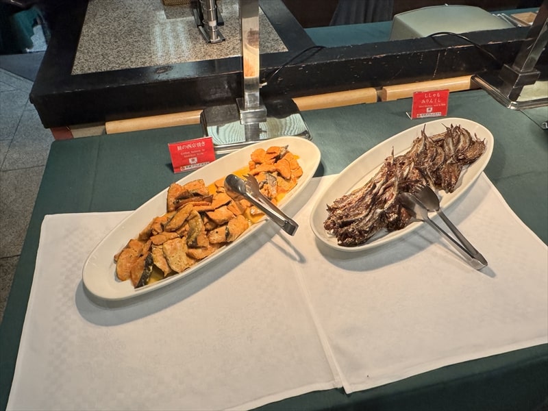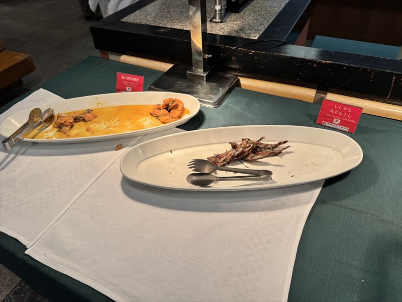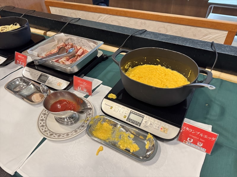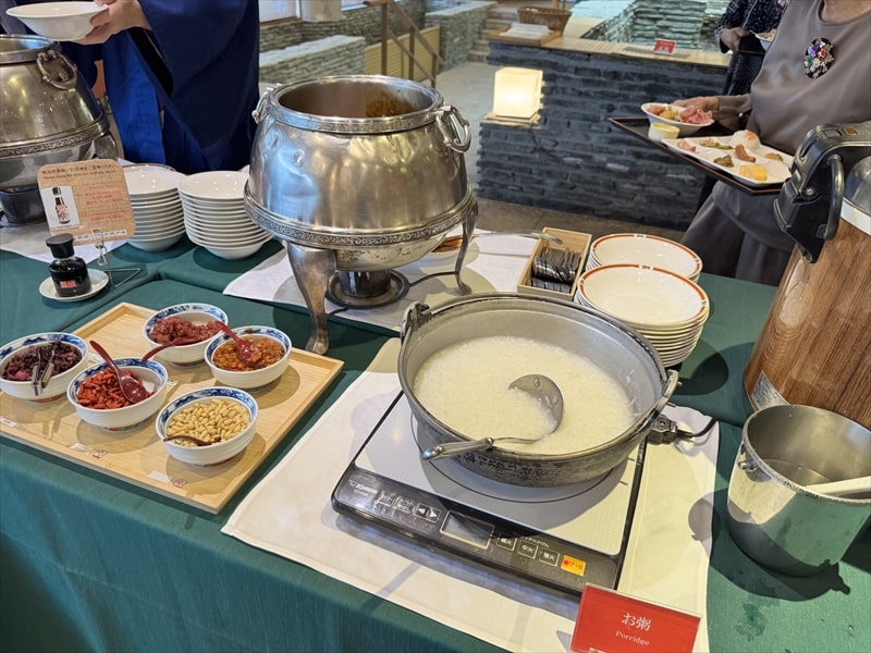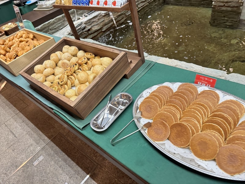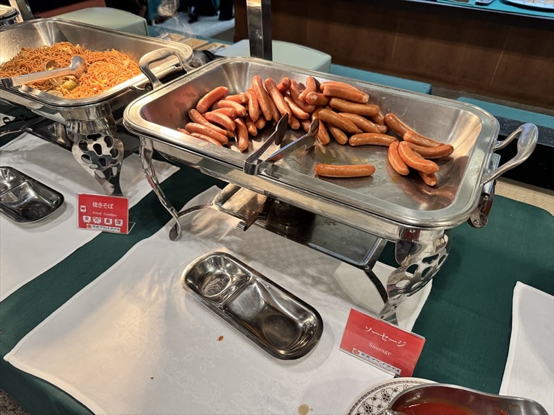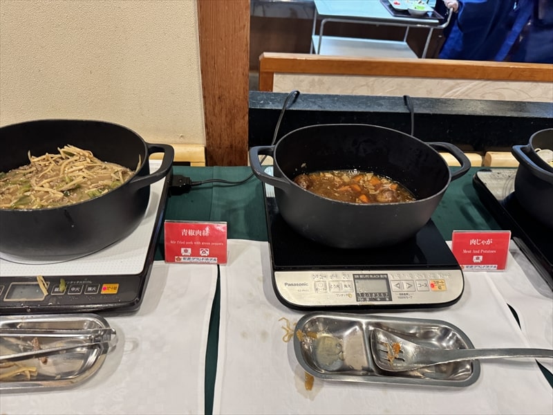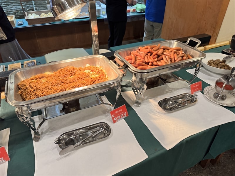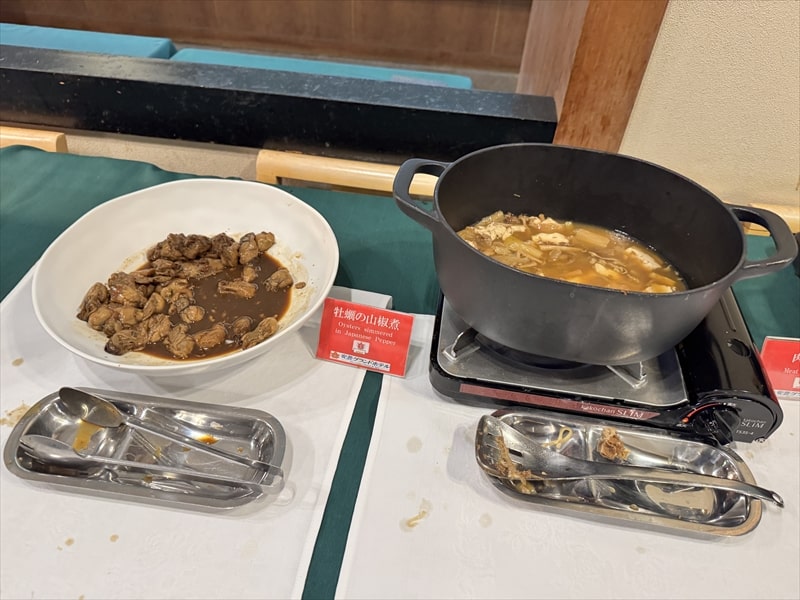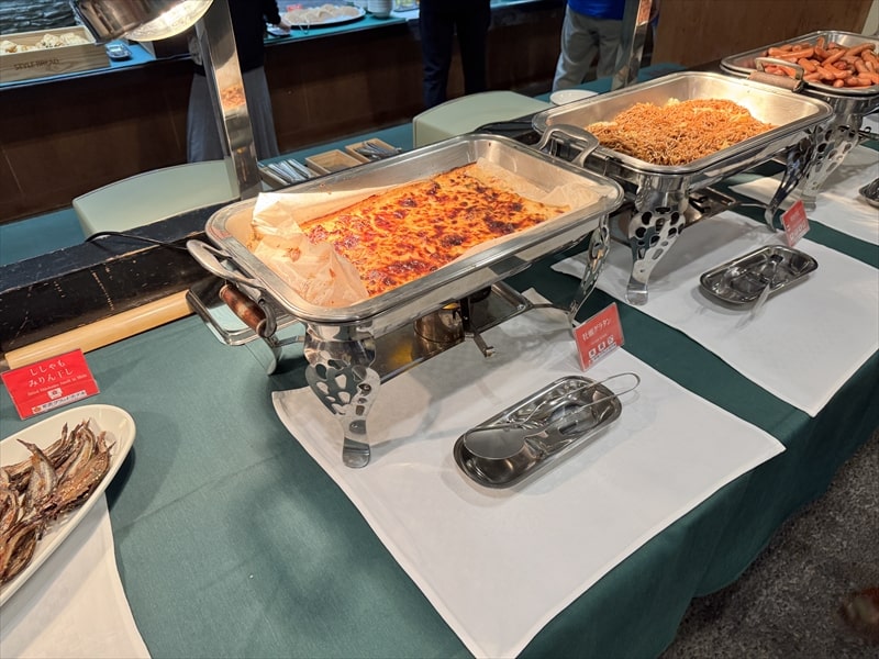 ビュッフェ料理はだし巻き卵、がんす、鮭の西京焼き、ししゃもみりん干し、牡蠣グラタン、焼きそば、ソーセージ、牡蠣の山椒煮、肉豆腐、生ハム、ポロニアソーセージ、青椒肉絲、肉じゃが、浅利パスタ、ベーコン、スクランブルエッグ、サラダ、パン、パンケーキ、おにぎり、お粥、味噌汁、納豆、海苔、カレー、シリアルなどとなっています。