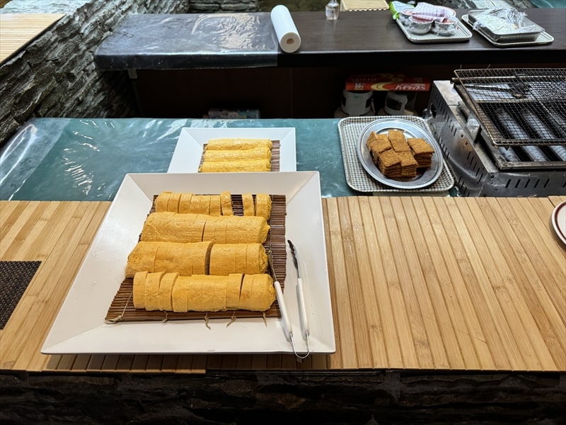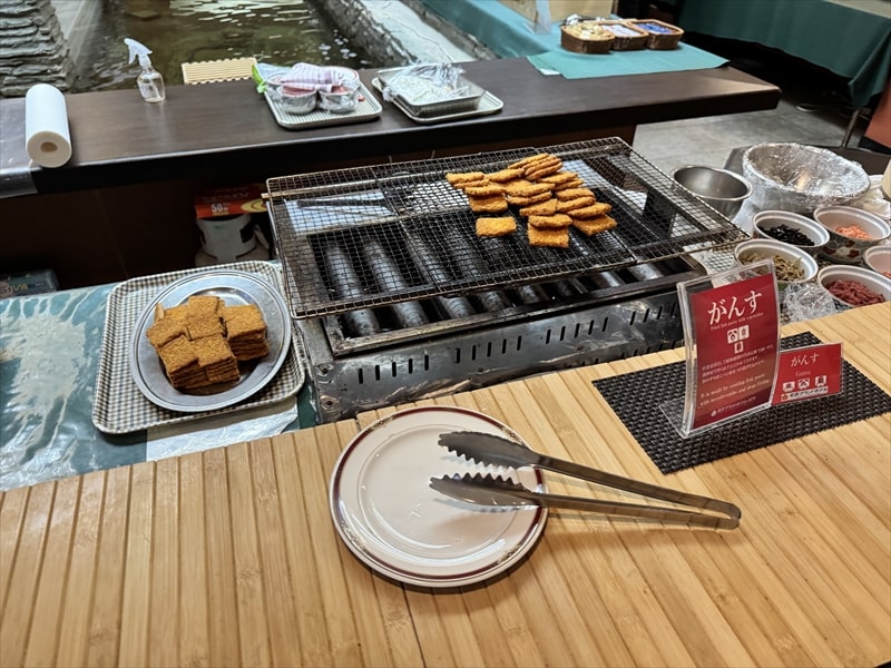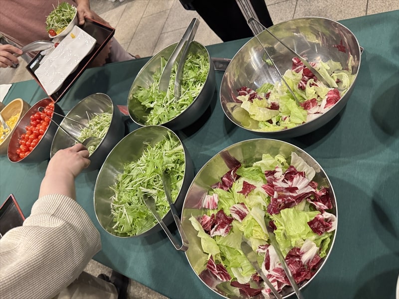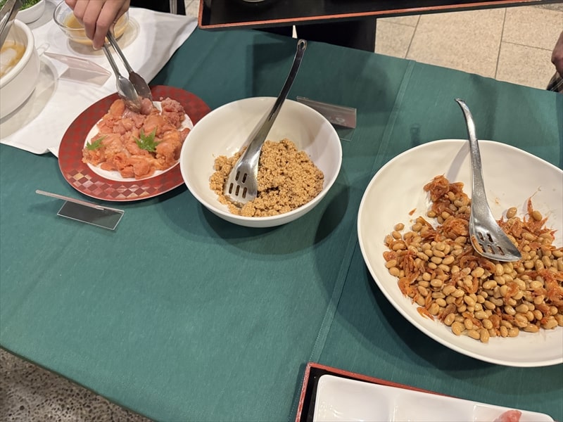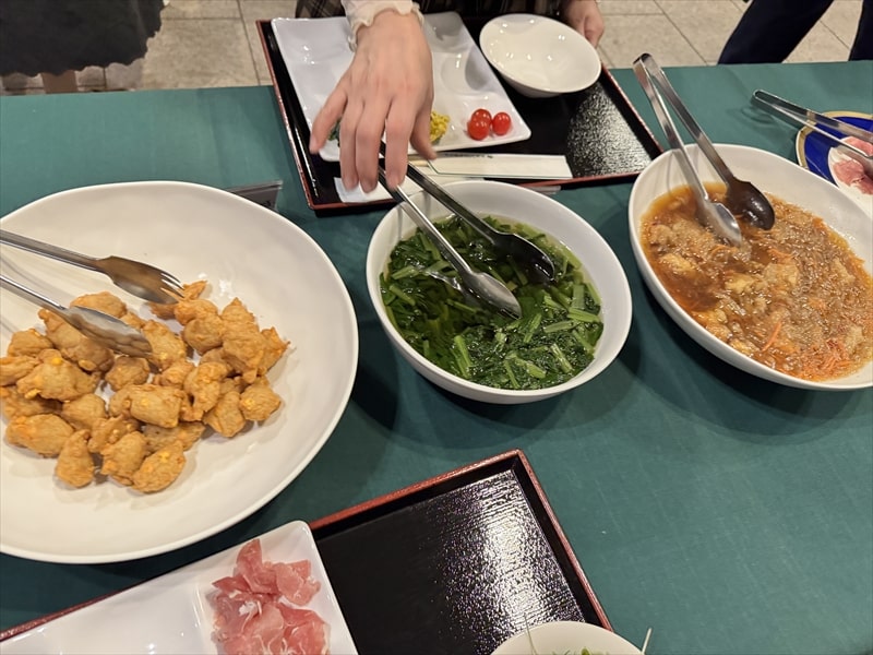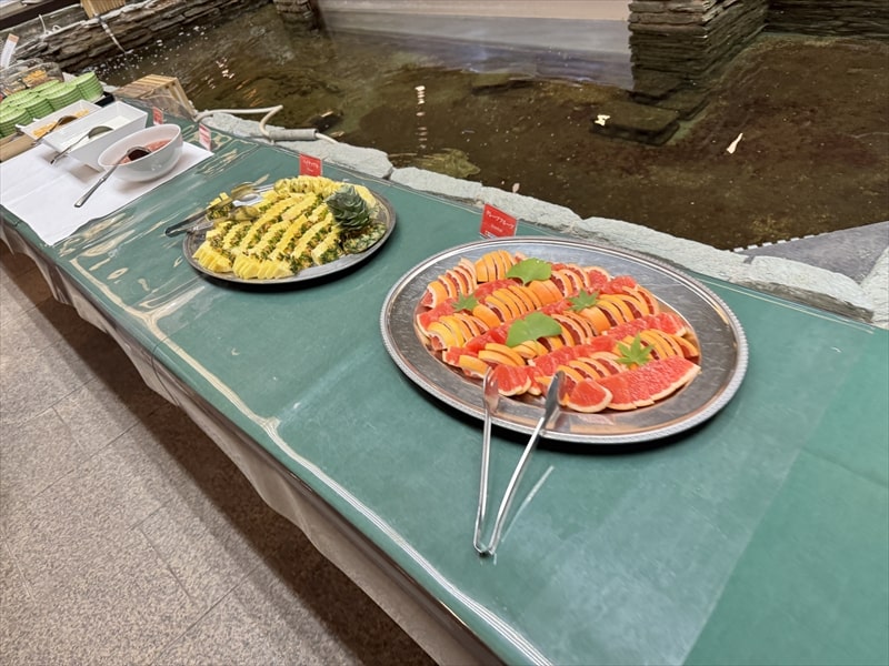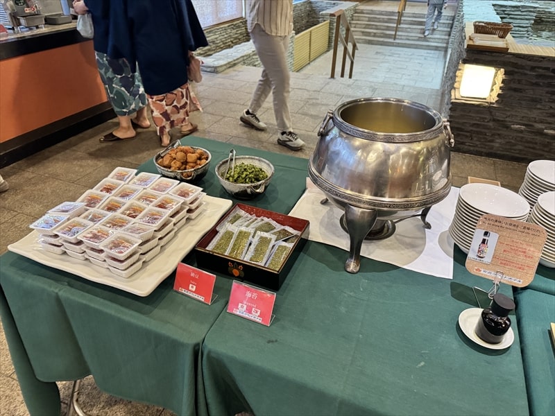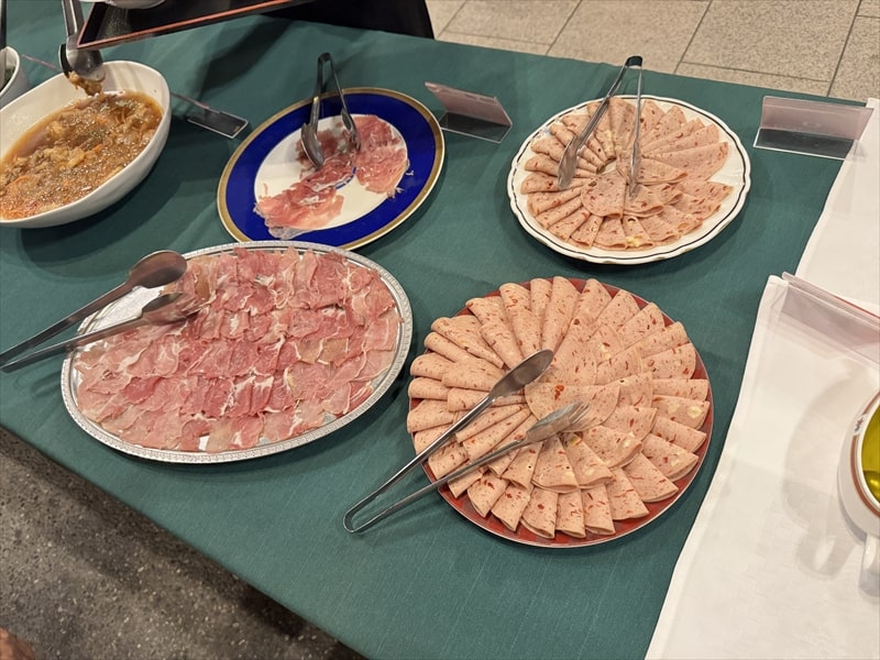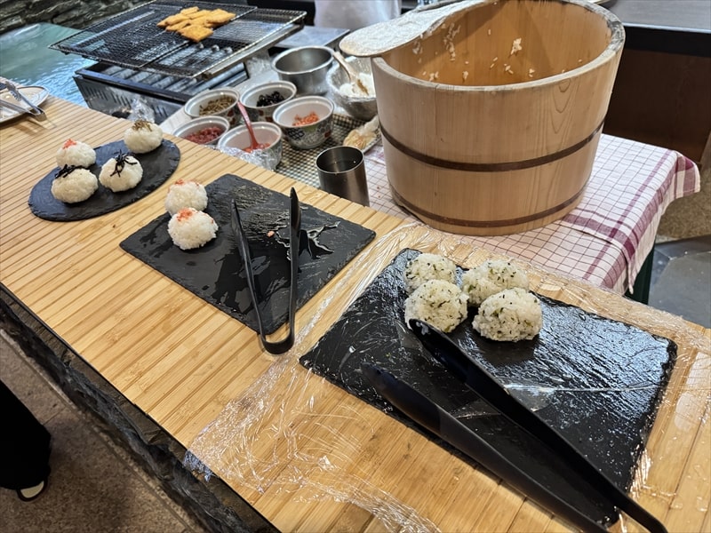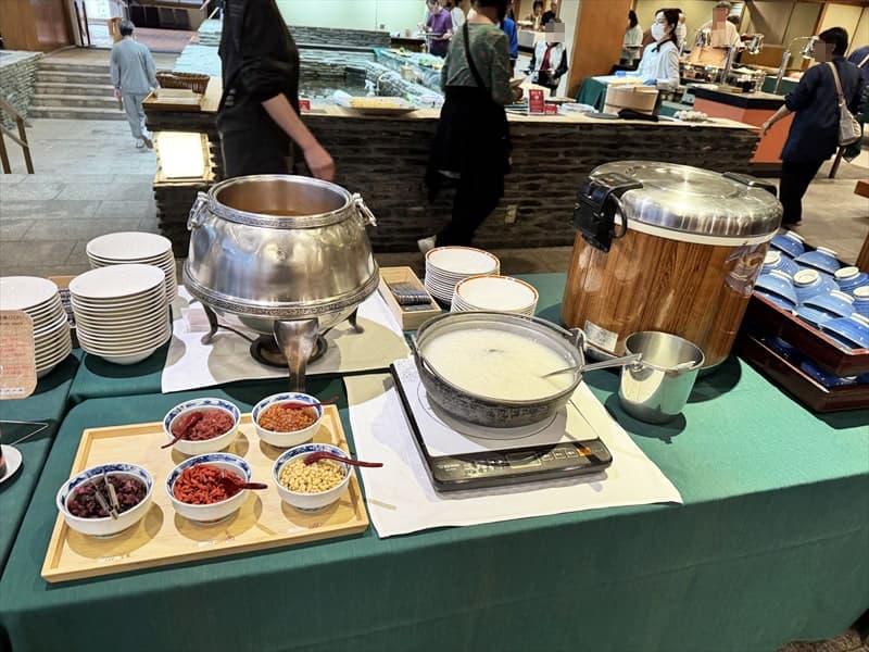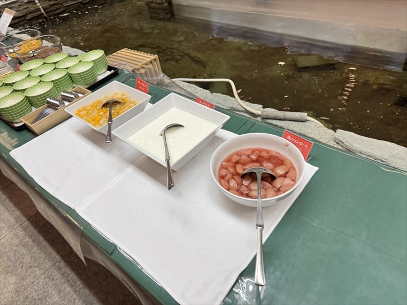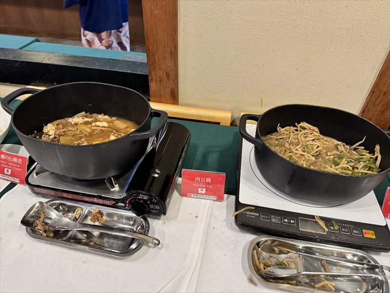 ビュッフェ料理はだし巻き卵、がんす、鮭の西京焼き、ししゃもみりん干し、牡蠣グラタン、焼きそば、ソーセージ、牡蠣の山椒煮、肉豆腐、生ハム、ポロニアソーセージ、青椒肉絲、肉じゃが、浅利パスタ、ベーコン、スクランブルエッグ、サラダ、パン、パンケーキ、おにぎり、お粥、味噌汁、納豆、海苔、カレー、シリアルなどとなっています。