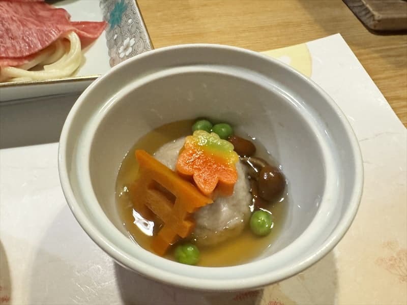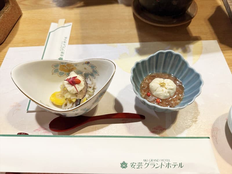炊合:蓮根白玉饅頭 紅葉麩 青豆 鳥居人参 滑子餡かけ