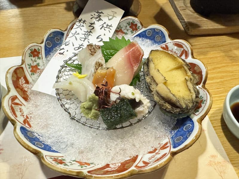 造里:鯛 鰤 烏賊 赤貝 鱧 鮑 宮島大根 紅蓼 山葵 菊花 佐伯造り醤油