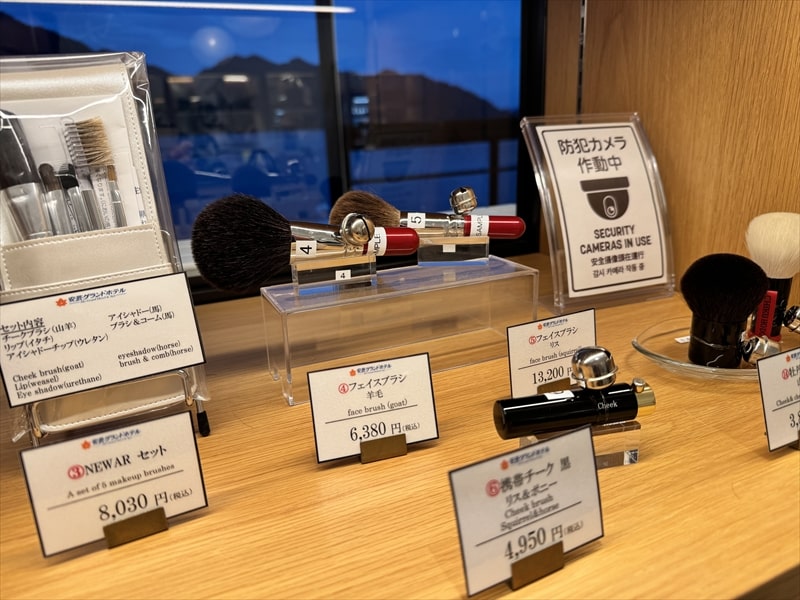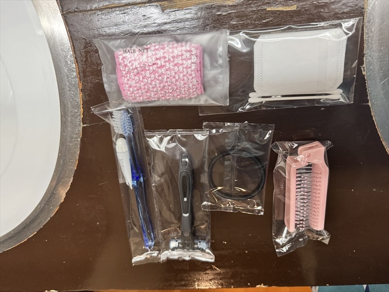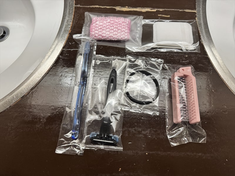 アメニティはブラシ、髪ゴム、髭剃り、歯磨きセット、コットンと綿棒、体洗いブラシが置いてありました。