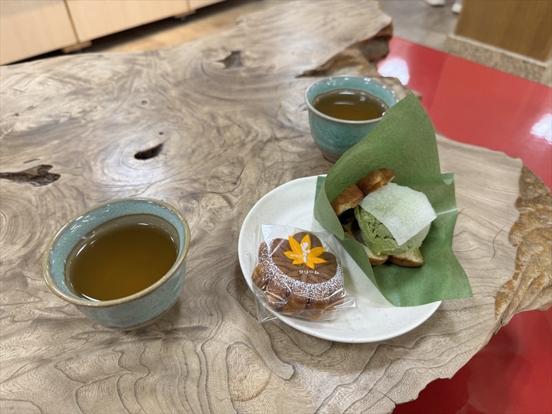 もみじ饅頭はだいこん屋というお店で頂き、店内で出来立てのもみじ饅頭やアイスサンドもみじの抹茶を各1個を注文しますと、椅子に座って無料のお茶を頂きながら食べることができました。
