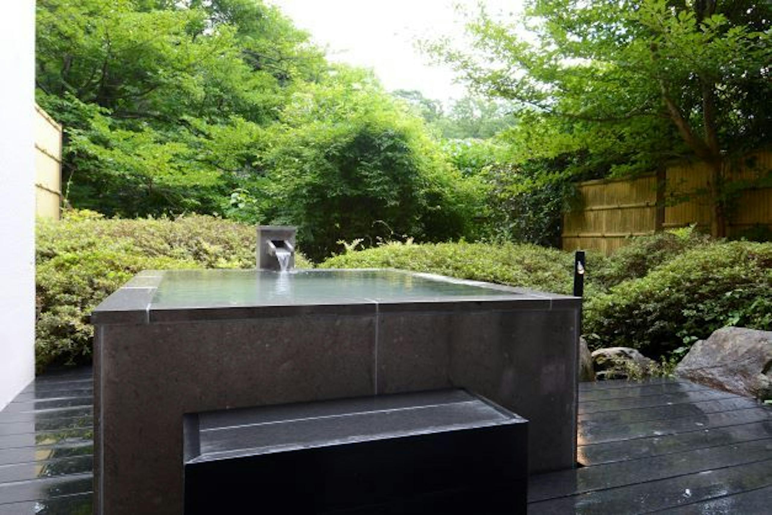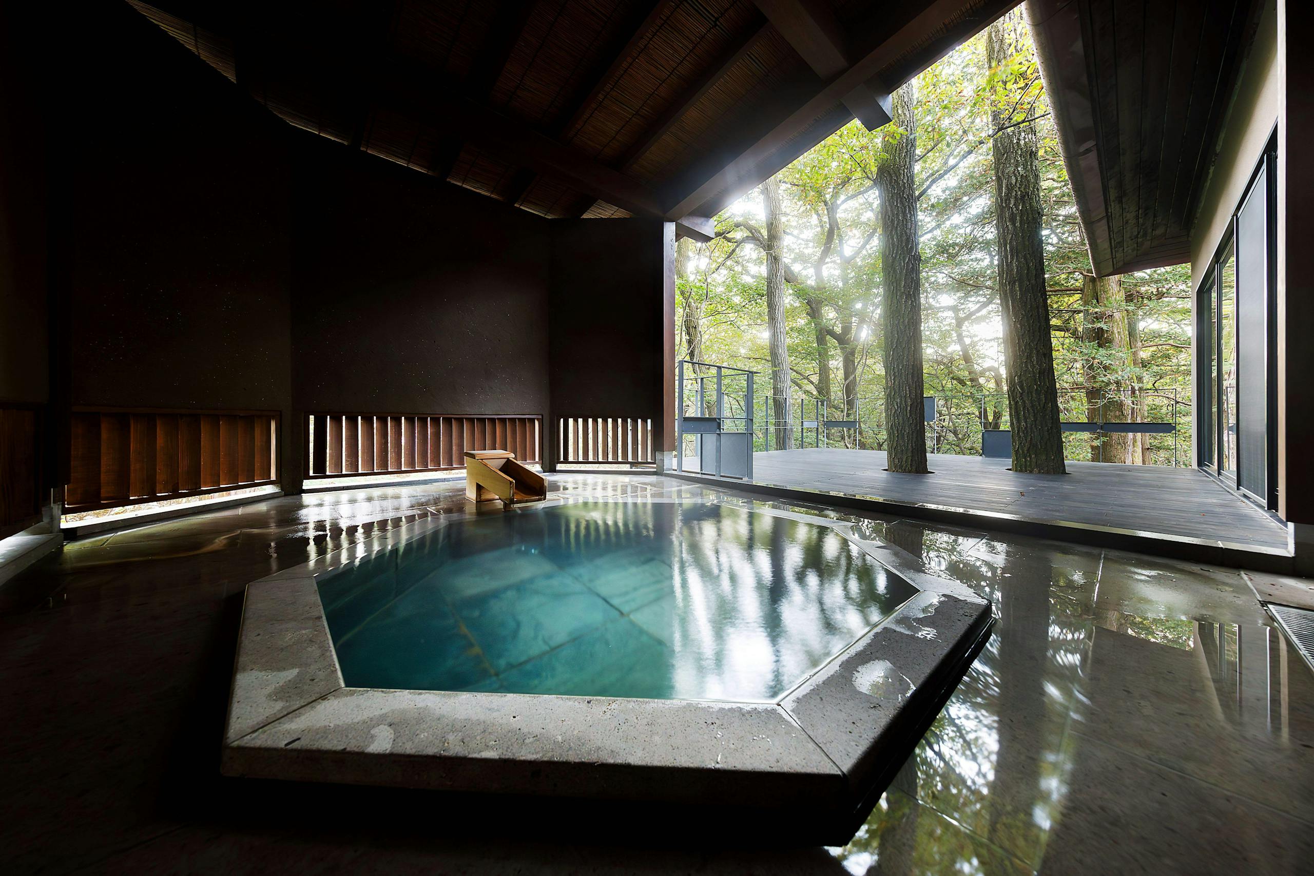 ・貸切露天風呂の「炭の湯」や「銅の湯」は那須高原の森を眺めながら静かに浸かれる